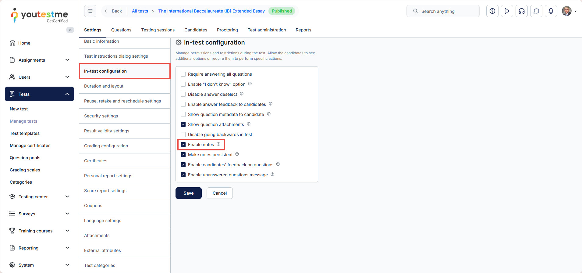 Note: Notes have to be enabled in test settings.