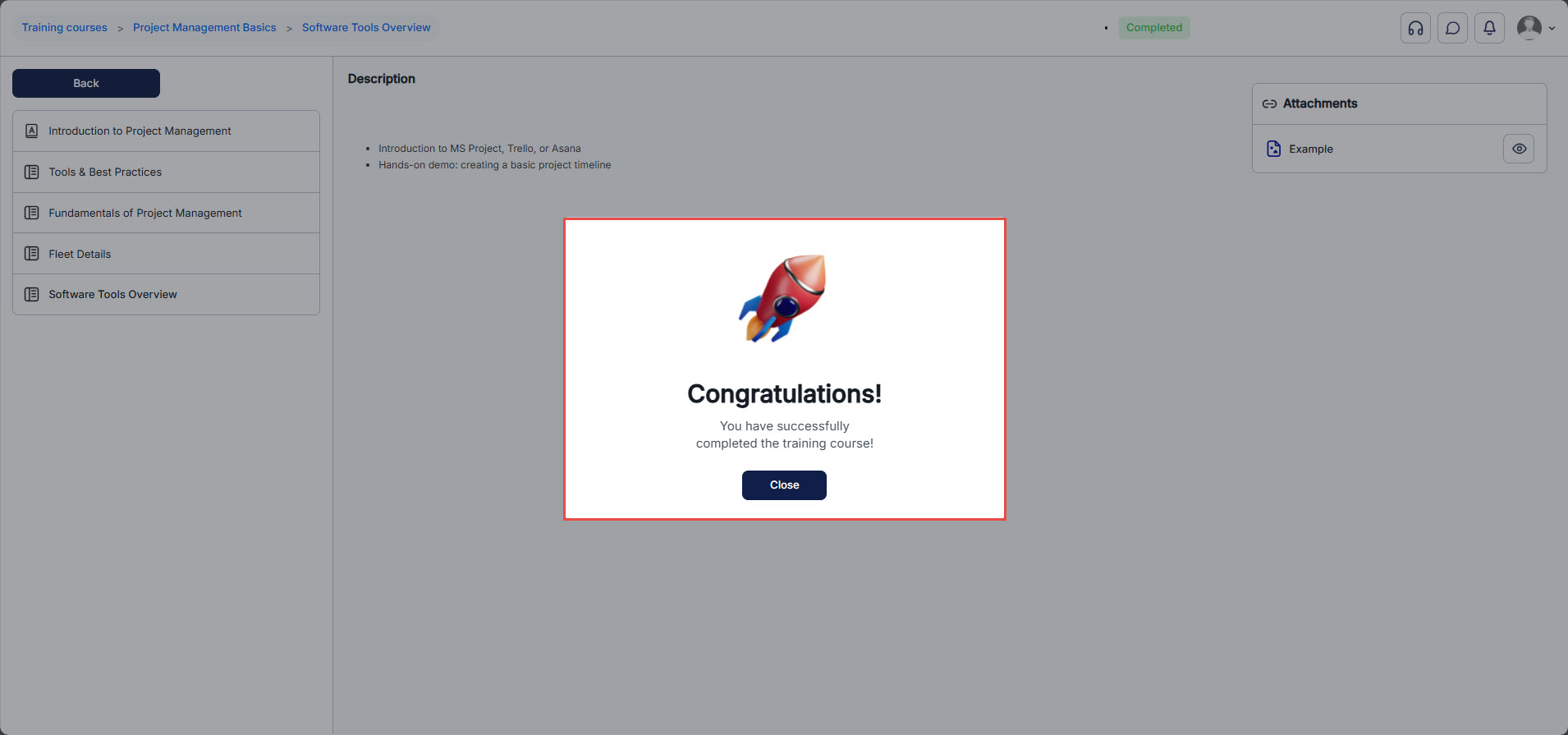 After passing the test in this training course step, you can complete the course. Click the Complete Training Course button, then confirm by clicking Close in the pop-up window.