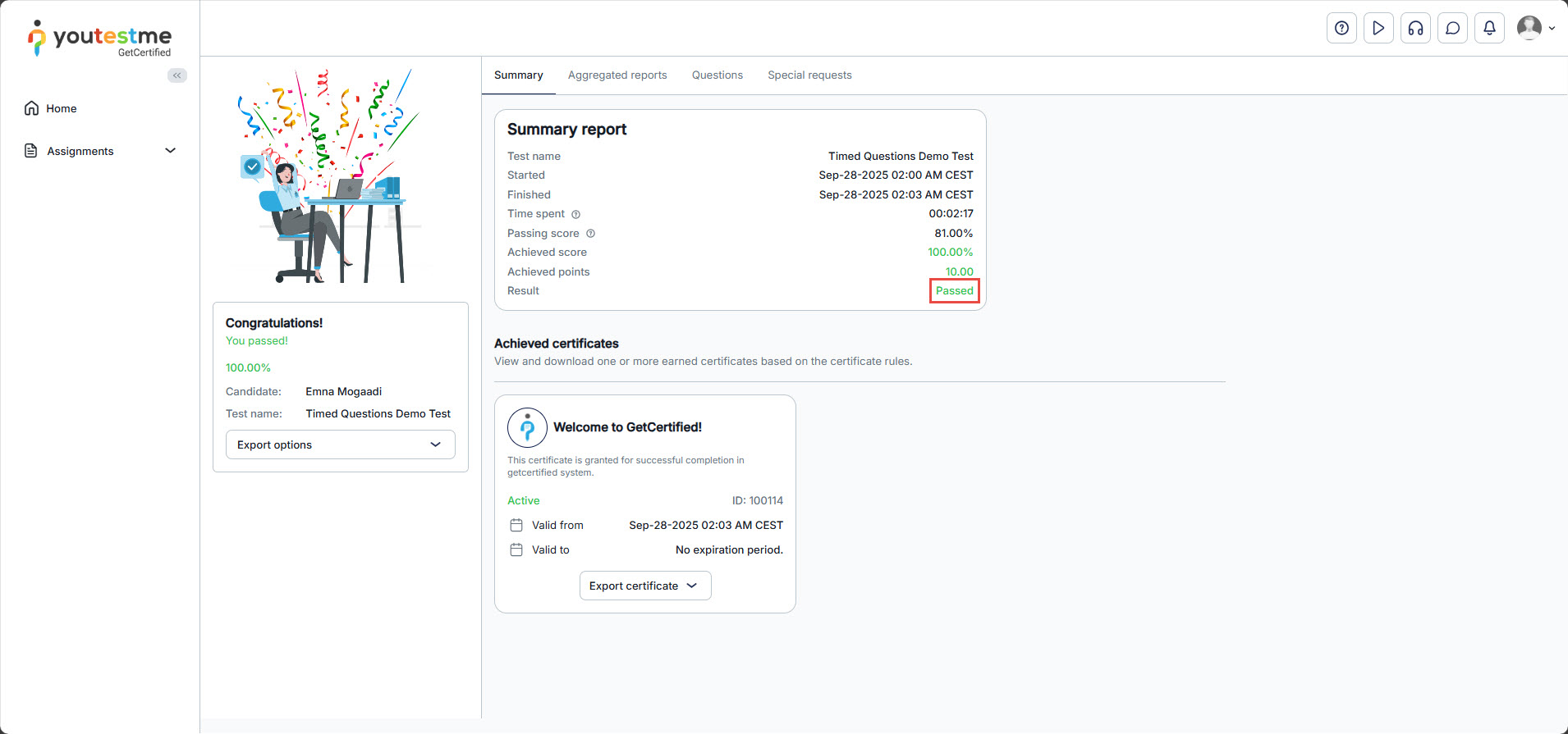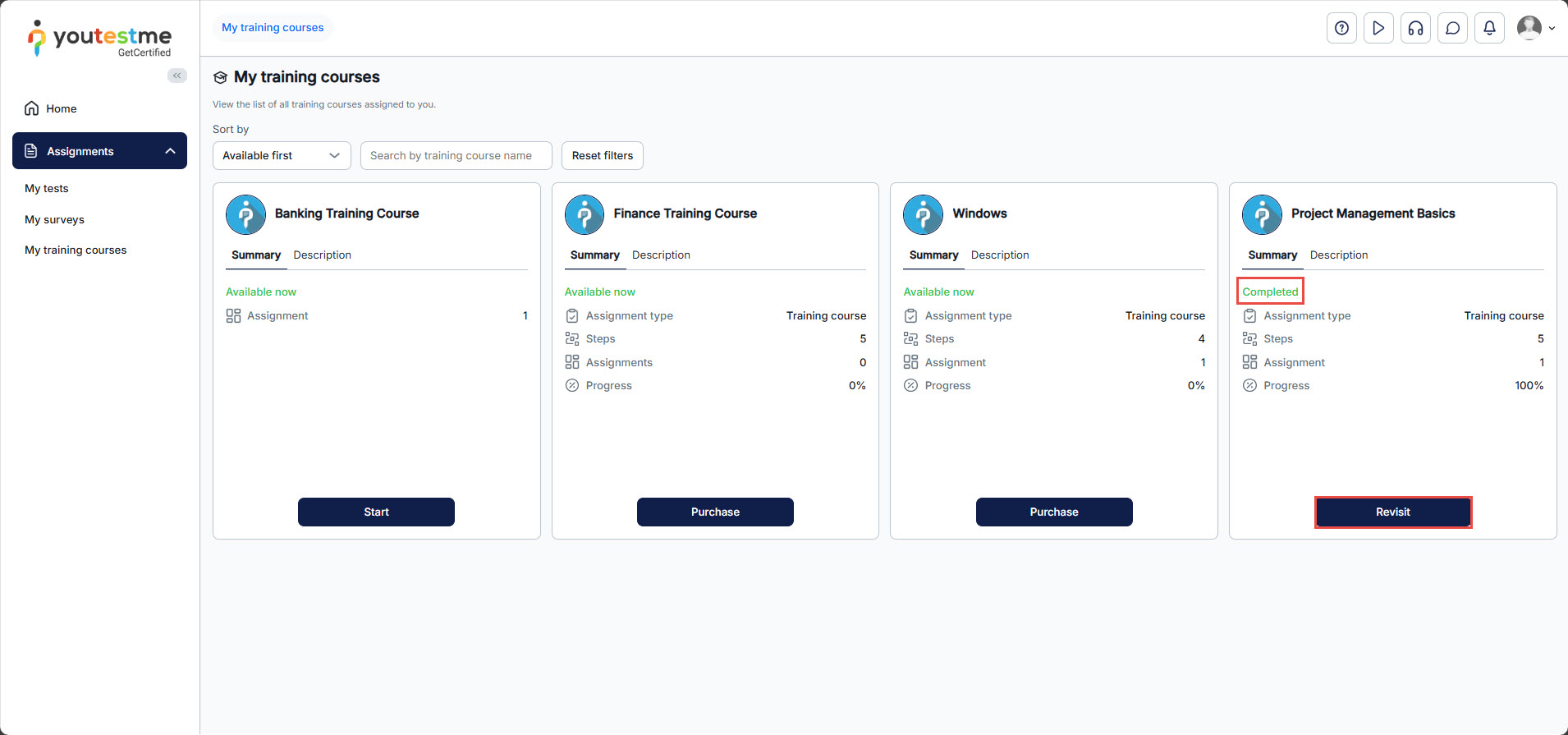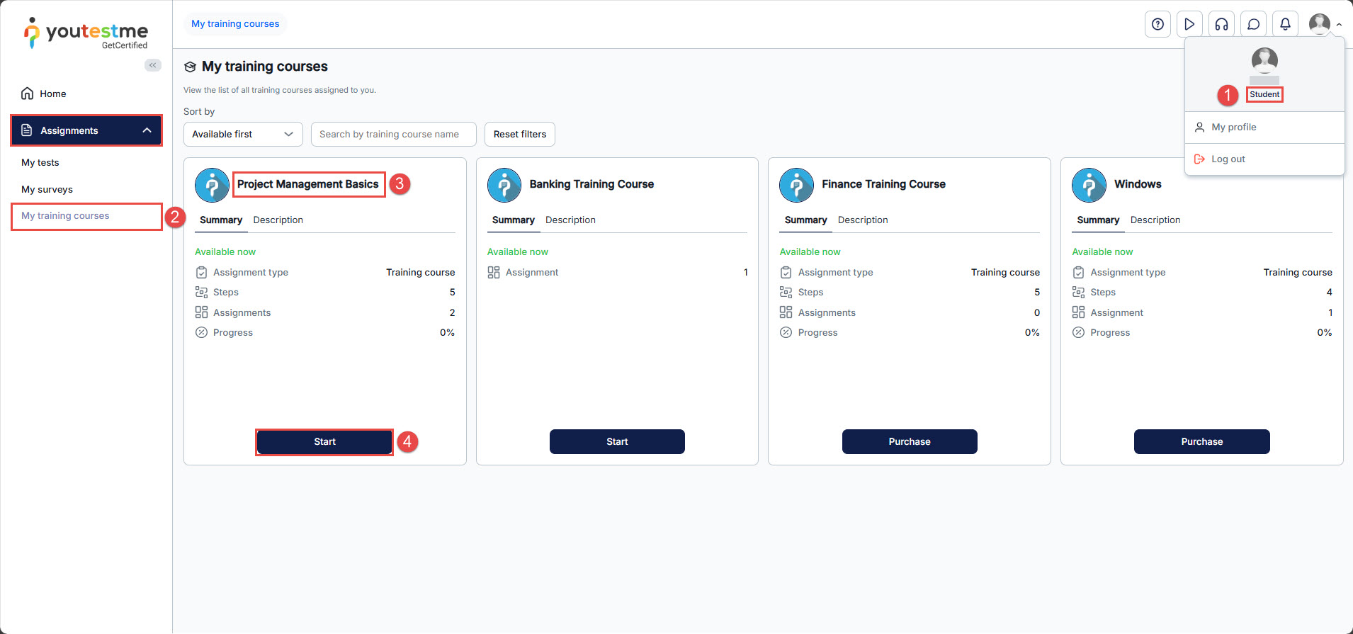 This article provides a simple guide on how to take a training course from the  Assignments tab in the YouTestMe GetCertified application. As a student, you can access all your assigned training courses in one place. By following the steps below, you’ll be able to easily start and complete the training course assigned to you.