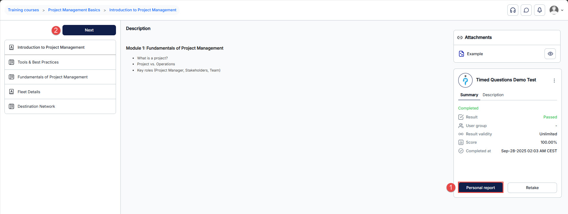 After you finish the test, you will gain access to your personal report . Then, you can proceed to the next step. As mentioned, you will not be able to complete the training course until you have passed all the tests related to it, regardless of whether the “Unlock all steps at once” option is enabled or not.