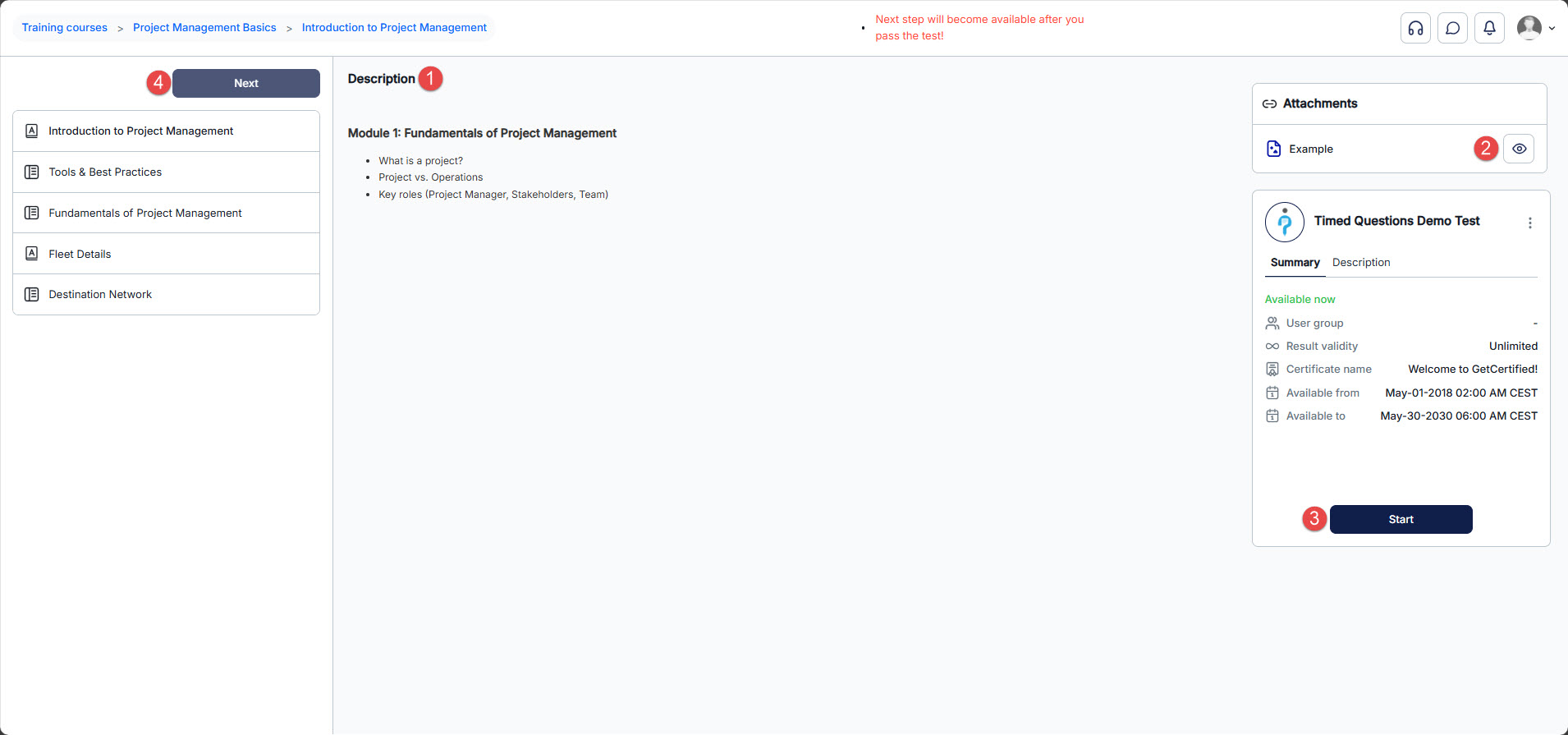 When you start a training course, you can progress step by step. If the “Unlock all steps at once” option is disabled, you must complete each step before moving to the next one. You cannot proceed to the next step until you have passed the test in the current step.