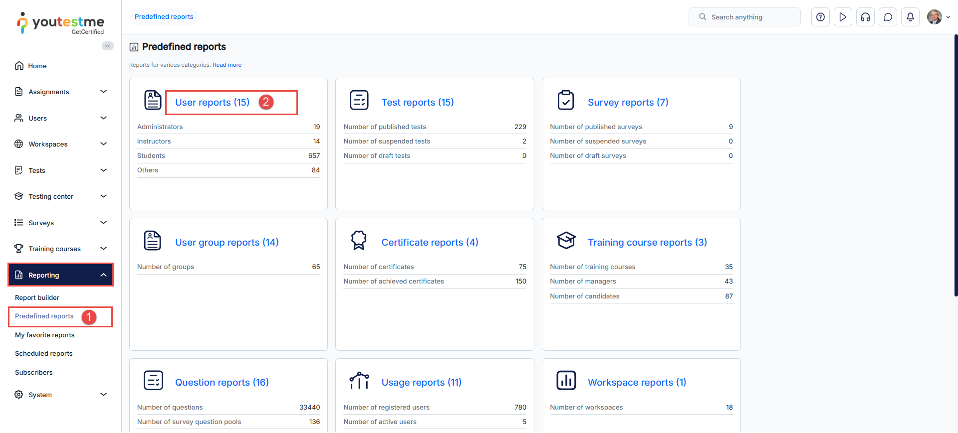 - Select the Reporting tab in the left-side menu and select the Predefined reports tab.