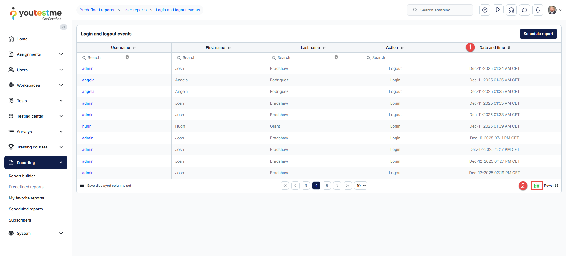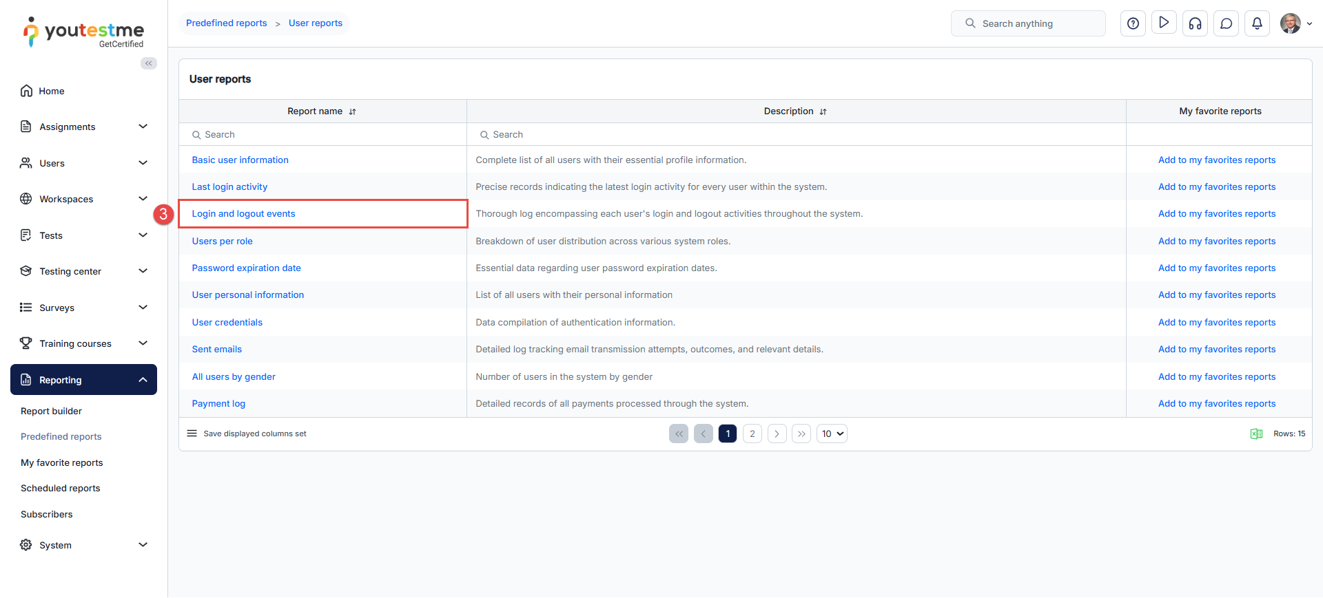- The table of all available user-related reports will appear. Find and click on the Login and logout events report.