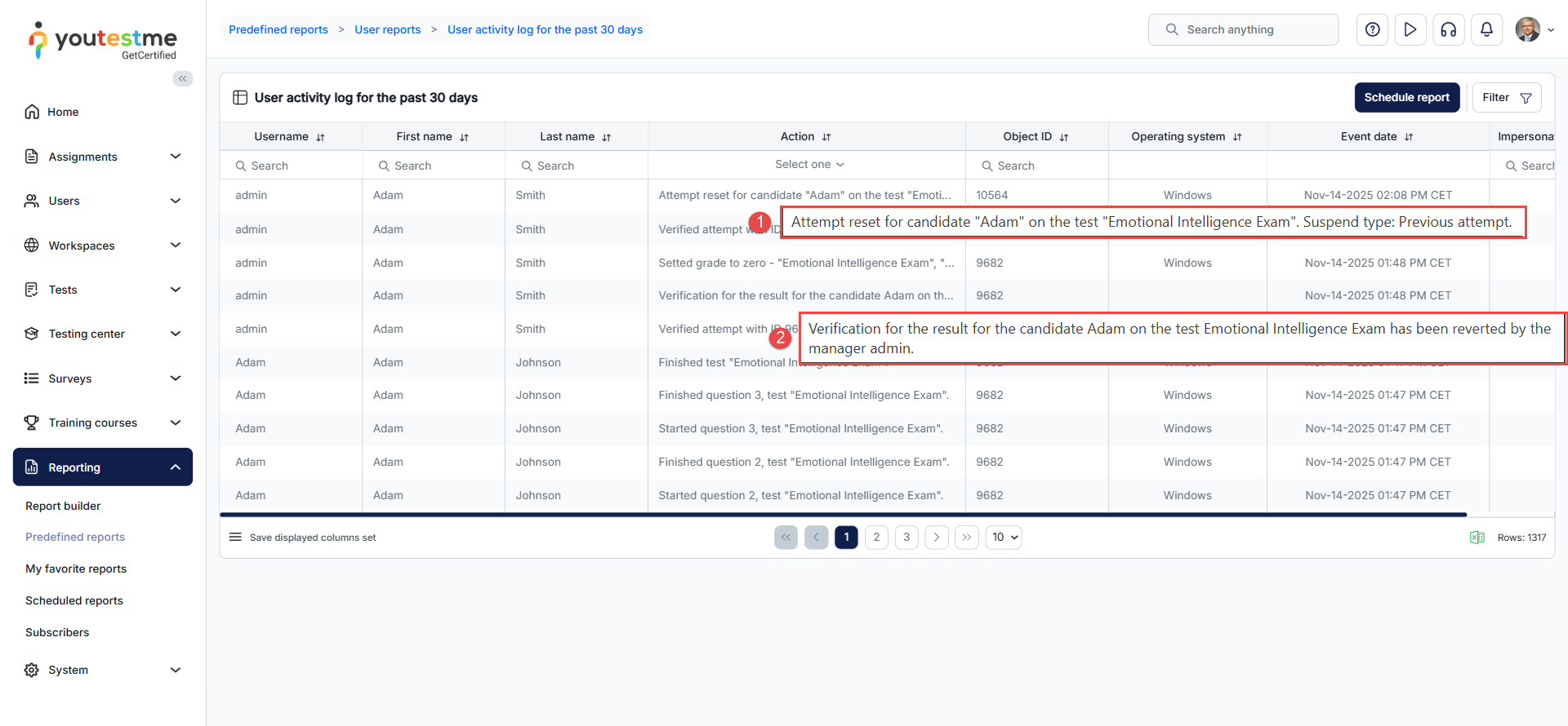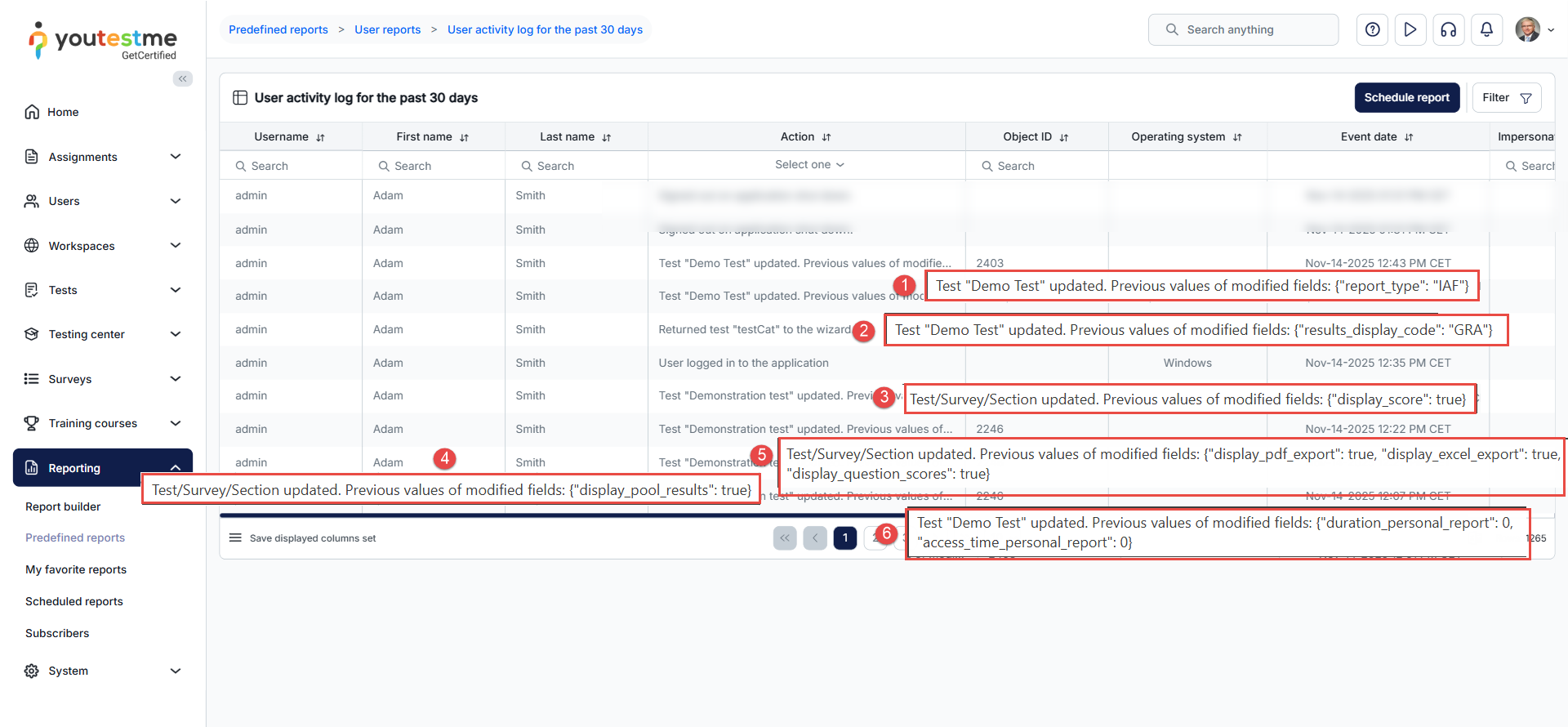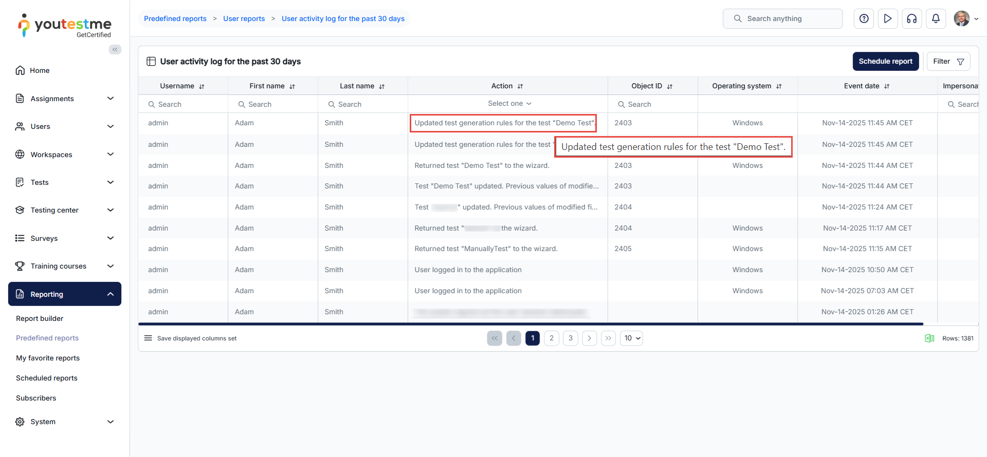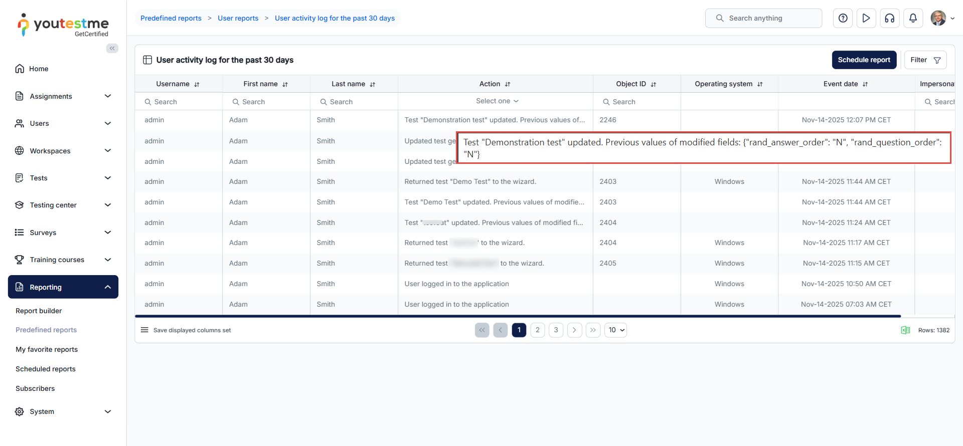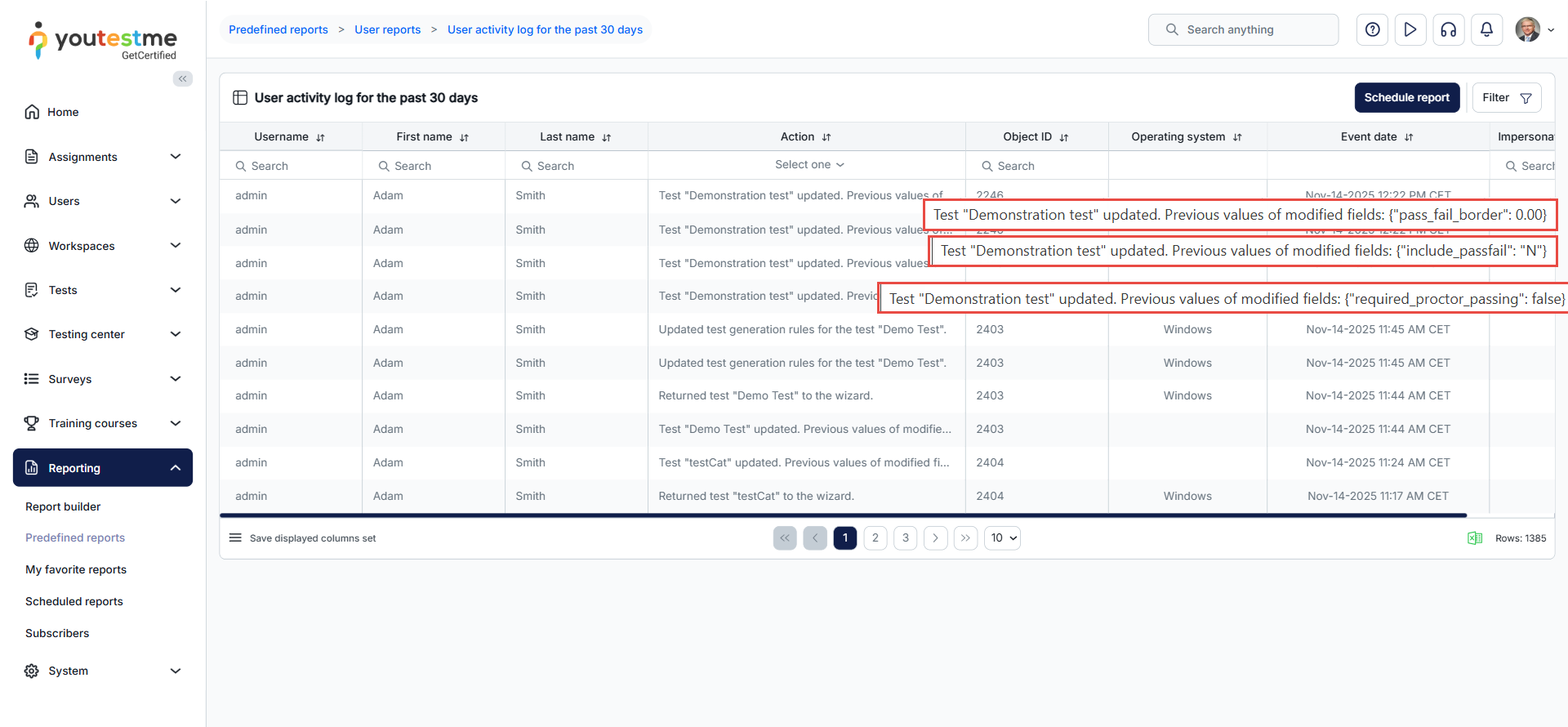 - Test Configuration Audit – All modifications to test settings, including rules, randomization, grading, and report configurations, are recorded and can be viewed in the User activity log for the past 30 days.You can access this report following the steps outlined in this article