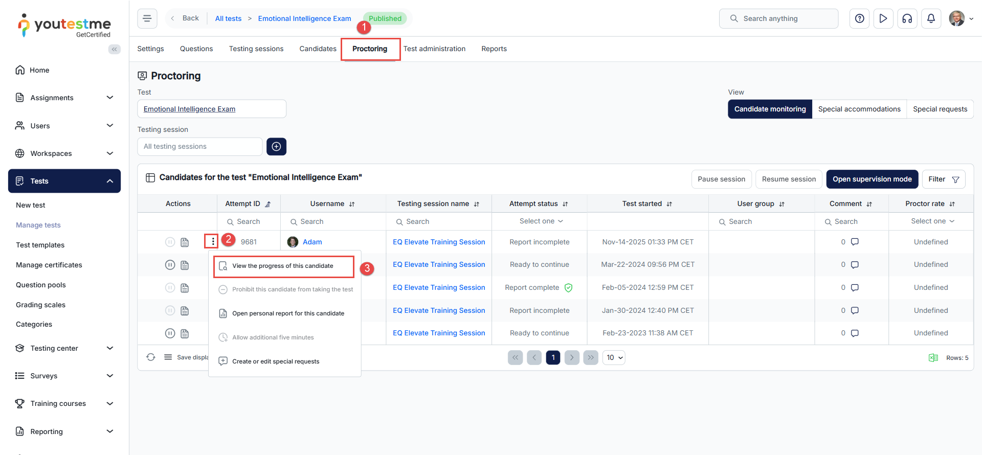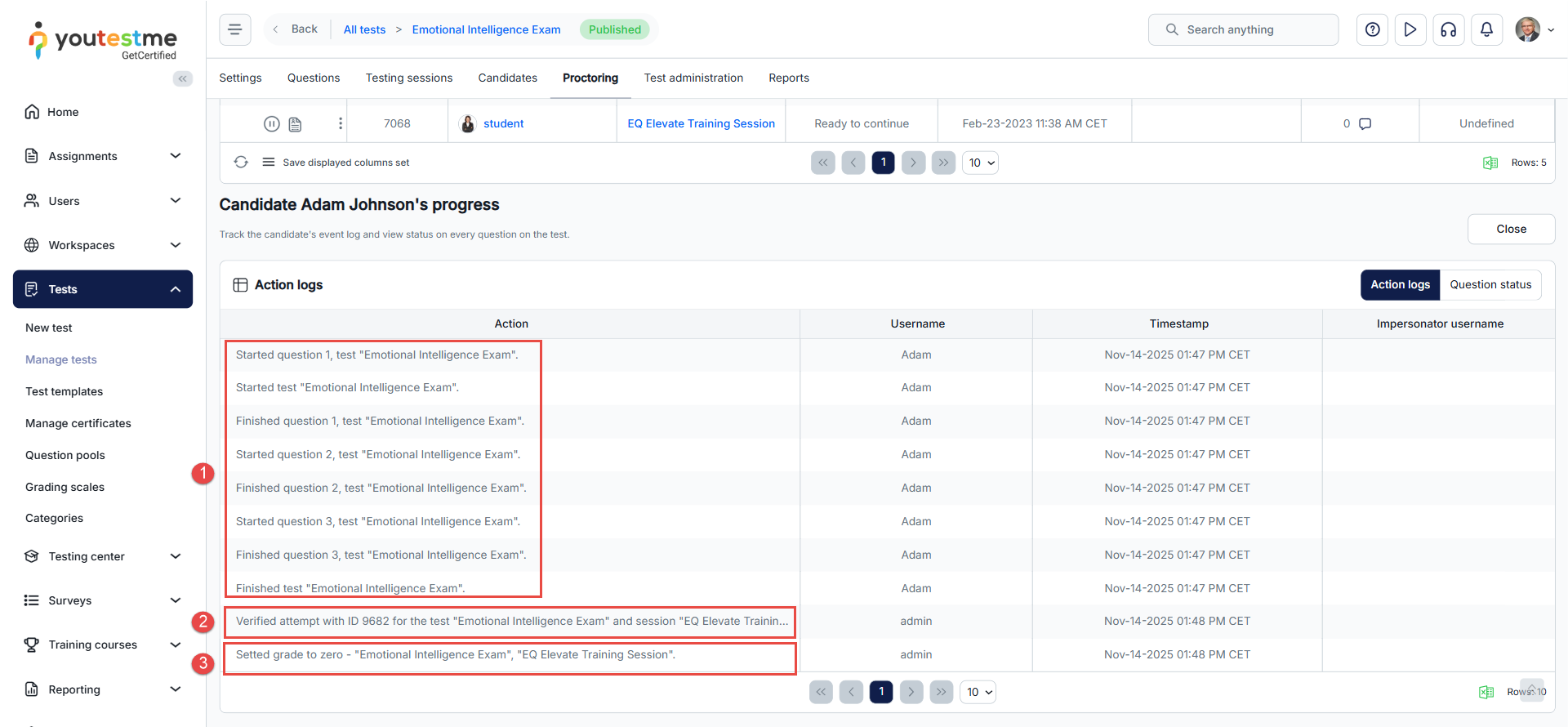 - Candidate Attempt Tracking – Actions taken on candidate attempts, such as verification, applying a zero grade, are documented under the Progress table for each candidate.