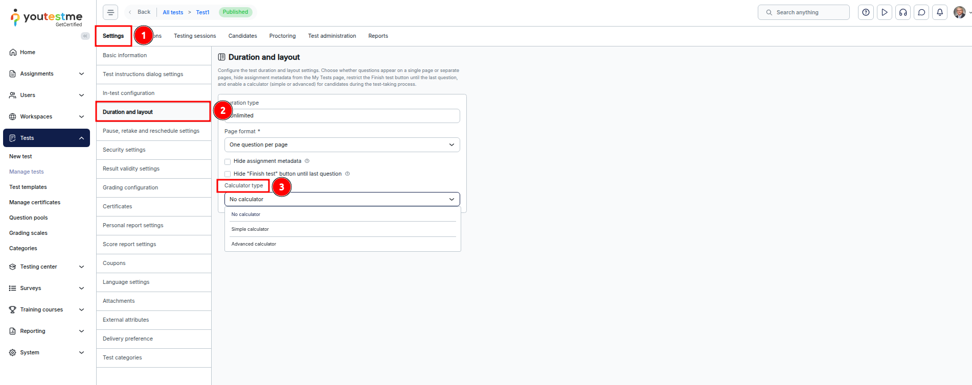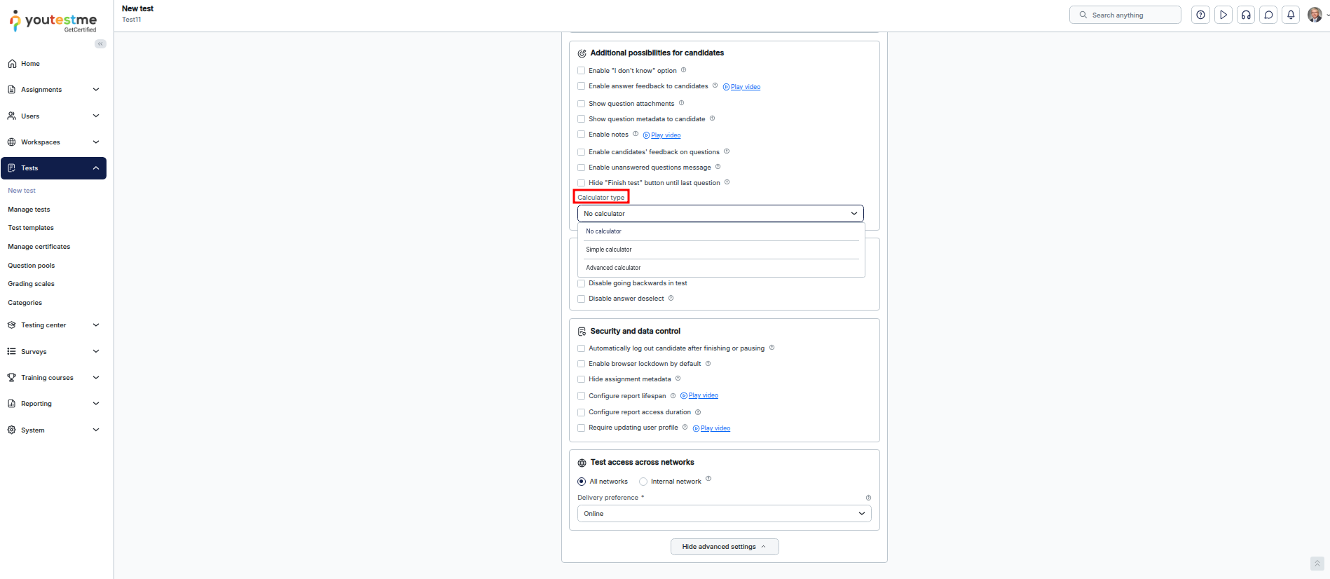 You can enable the calculator and choose its type while creating a test using the test wizard. To do so: