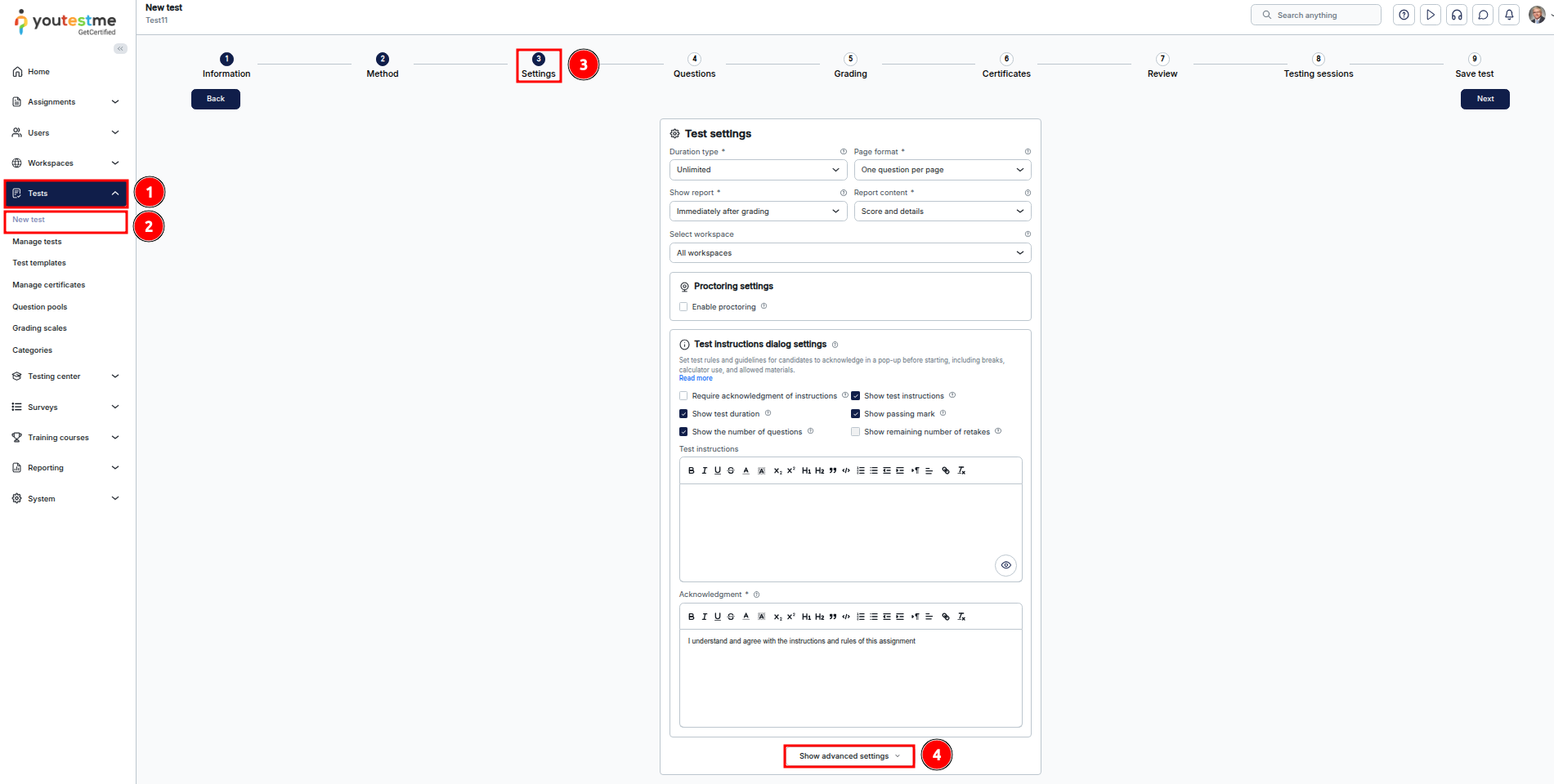 - In Step 3 of the test wizard, click on Show advanced settings.