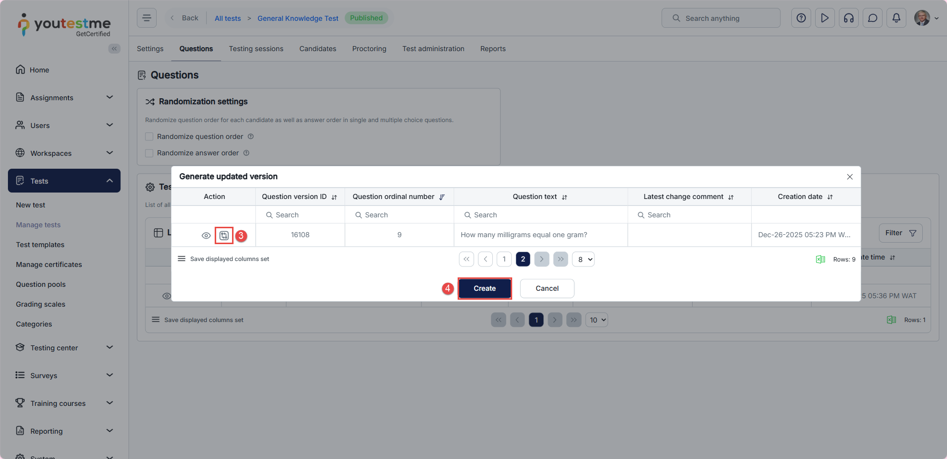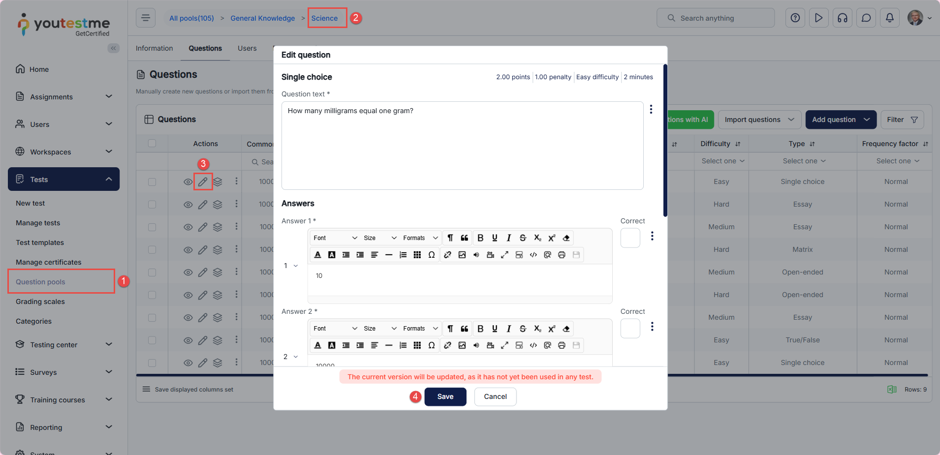 To update a test version in YouTestMe, follow these steps to ensure that the latest version of questions is correctly applied.