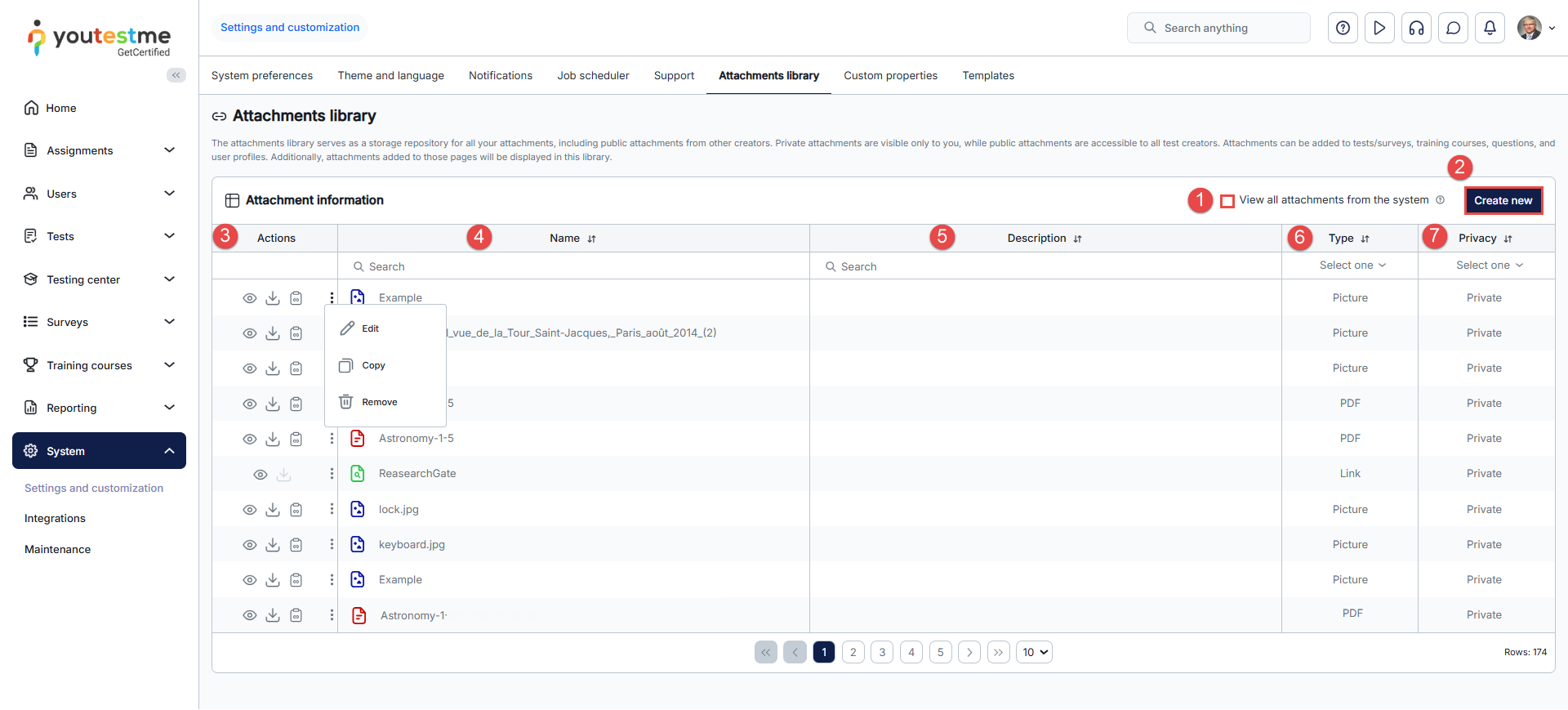 - Privacy Column: Indicates whether the attachment is private or can be used by any user to create tests, training courses, or questions.
