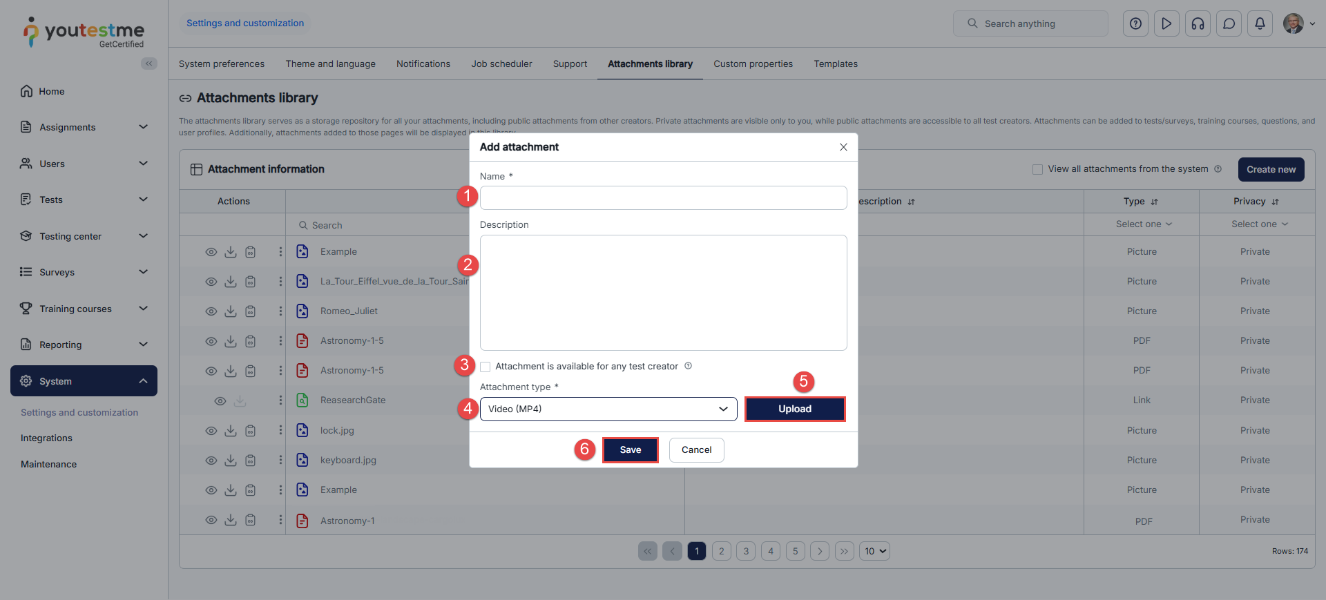This article provides a detailed walkthrough for uploading attachments to the attachments library, which enables you to later attach them to tests, training courses, or questions.