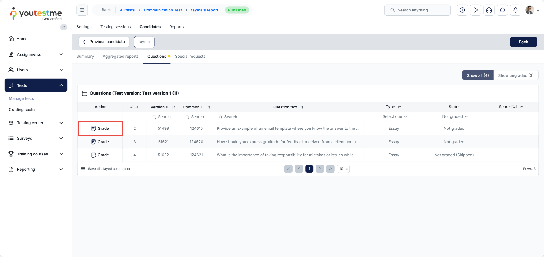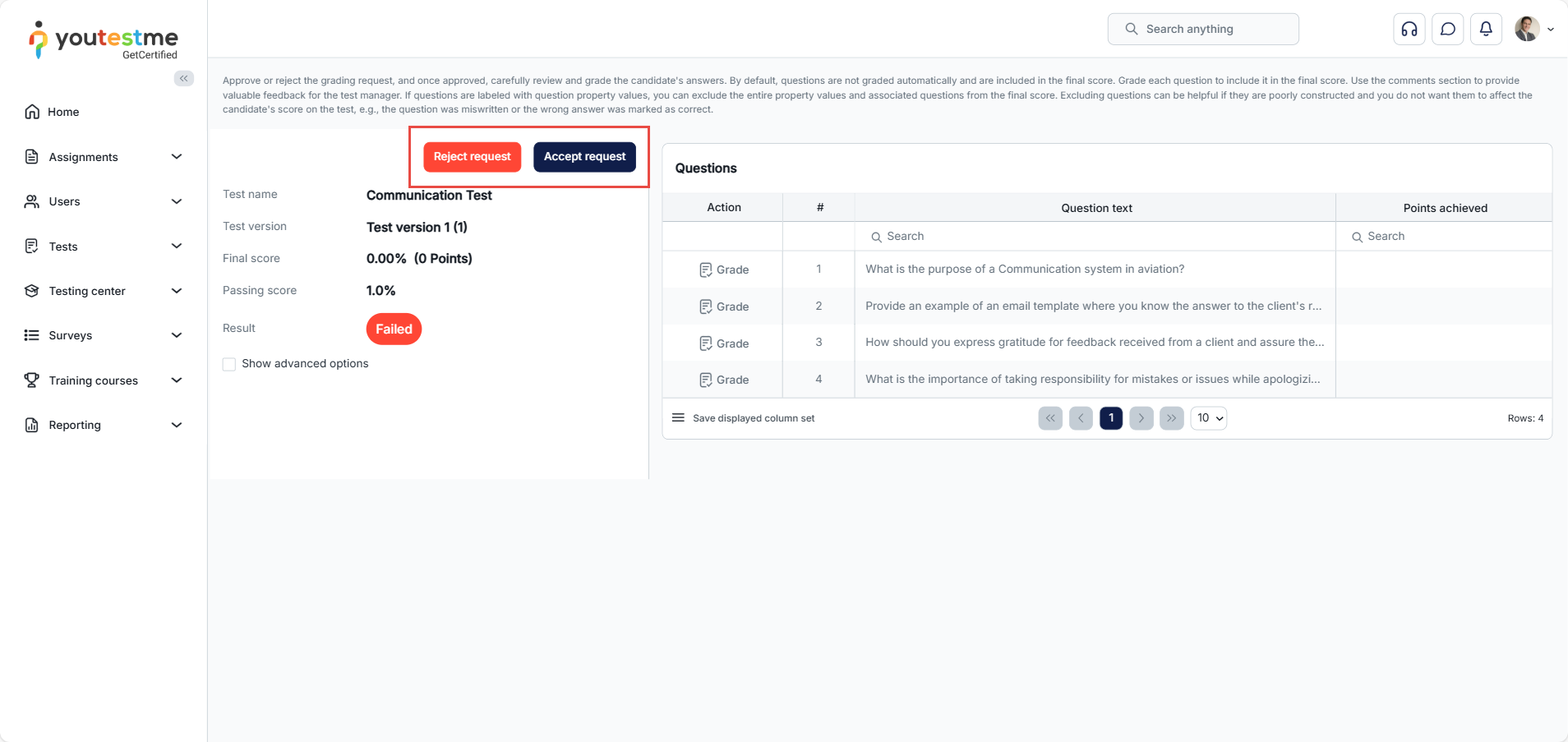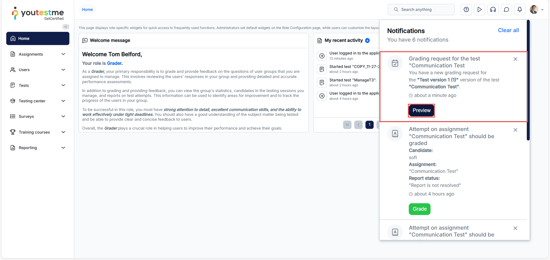 This article provides a detailed guide for users assigned the Grader security role in YouTestMe GetCertified. It explains how graders can access the tests they are responsible for, review test attempts, and leave grades and feedback while working within the permissions assigned to their role.