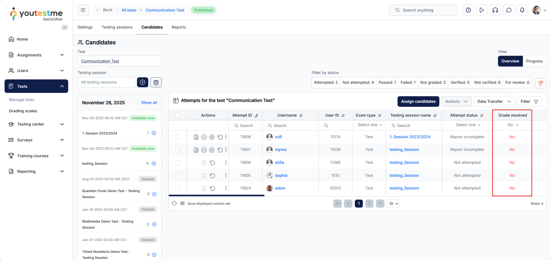 - When you select the Candidates tab, you can see candidates in the testing session of the user group this grader manages and their reports of test attempts: