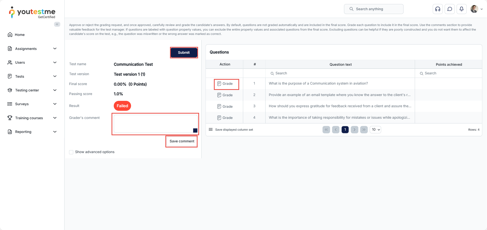 After accepting the test, the Grader’s comment field will be displayed. They can add comments and grade the attempt.