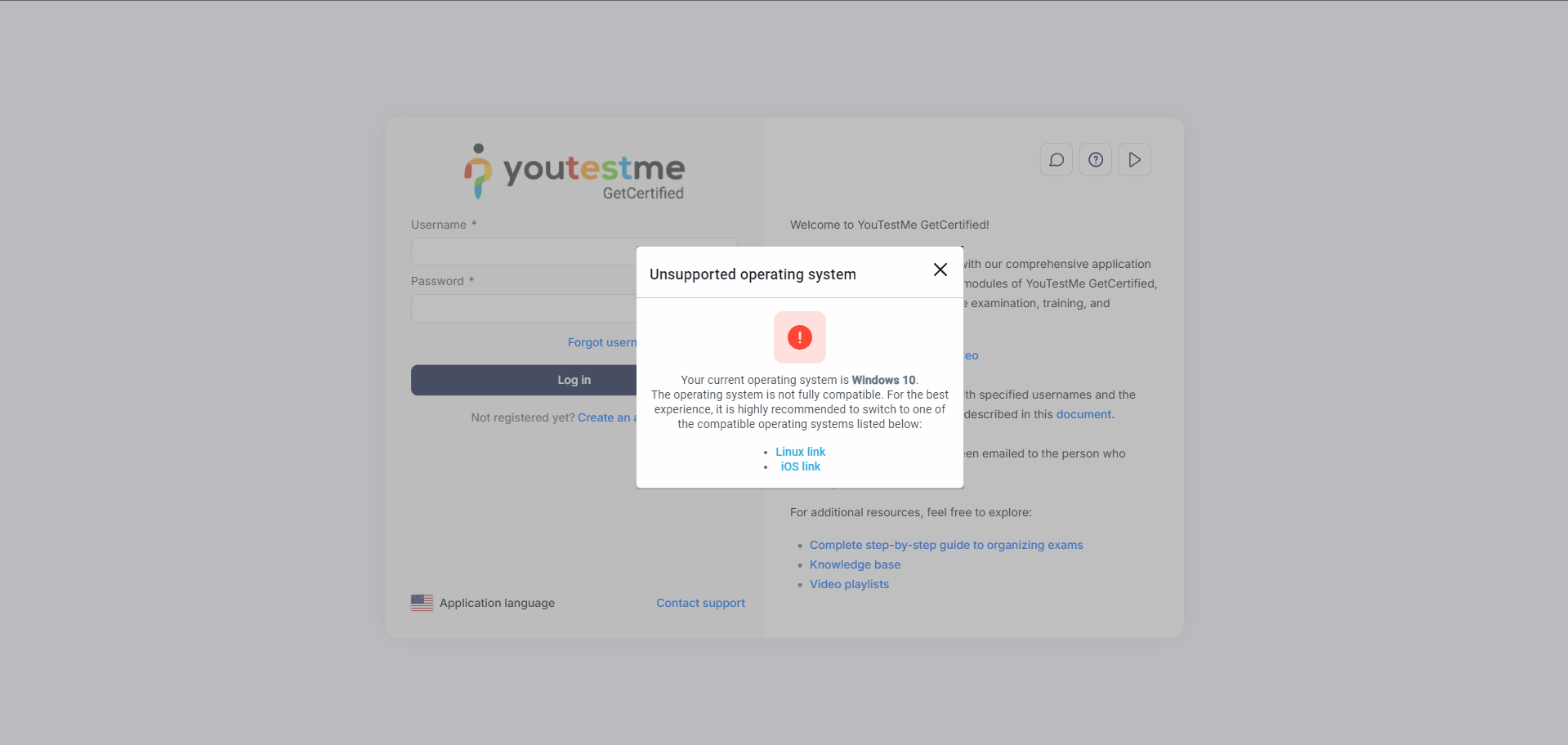 When the Forbid using unsupported operating systems option is unchecked, the user can close the warning and access the application: