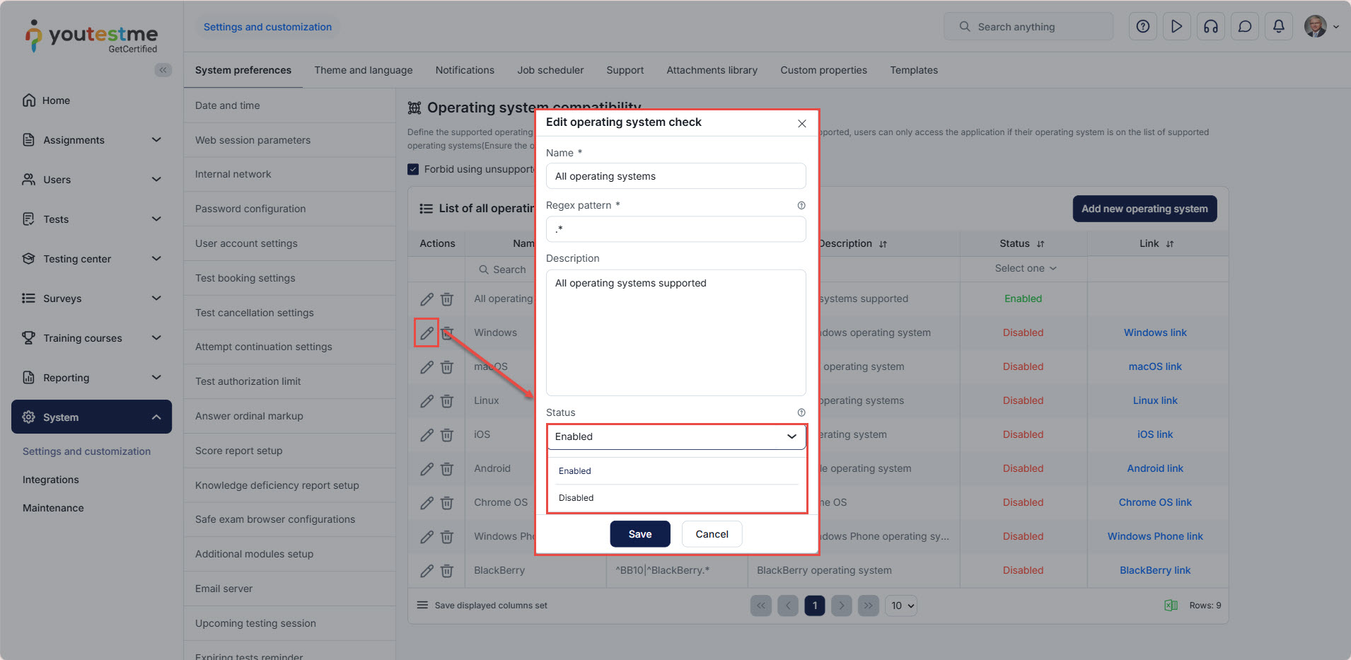 5. Define Status – The operating system must be enabled to be considered when comparing the user’s operating system against supported operating systems. If the status is disabled, the operating system is not used for the comparison.