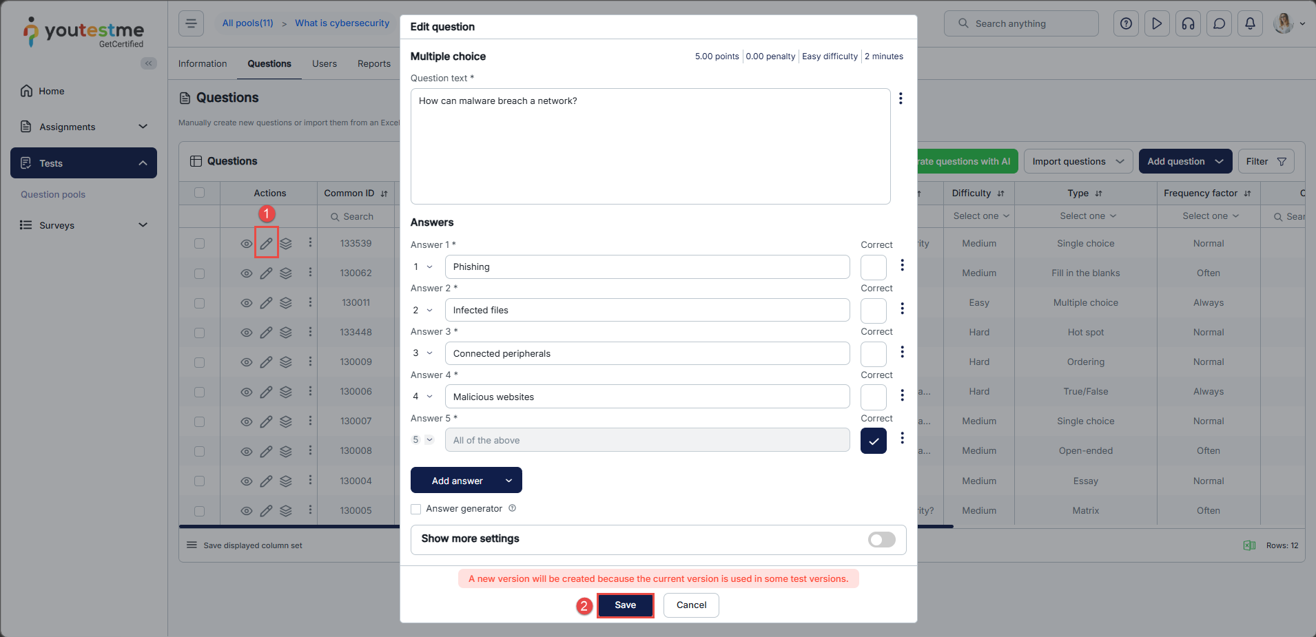 - By clicking the Edit button for a desired question, you can edit the question text, points, difficulty, and all the advanced settings except the question type. The process of editing questions is the same as for adding. For instructions on editing/adding questions, please visit the Adding questions chapter.
