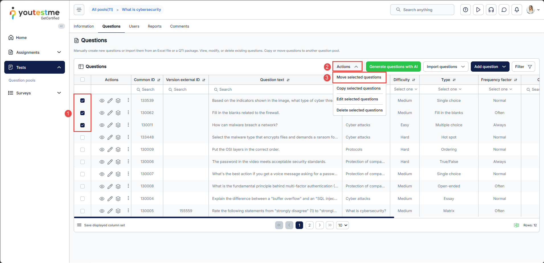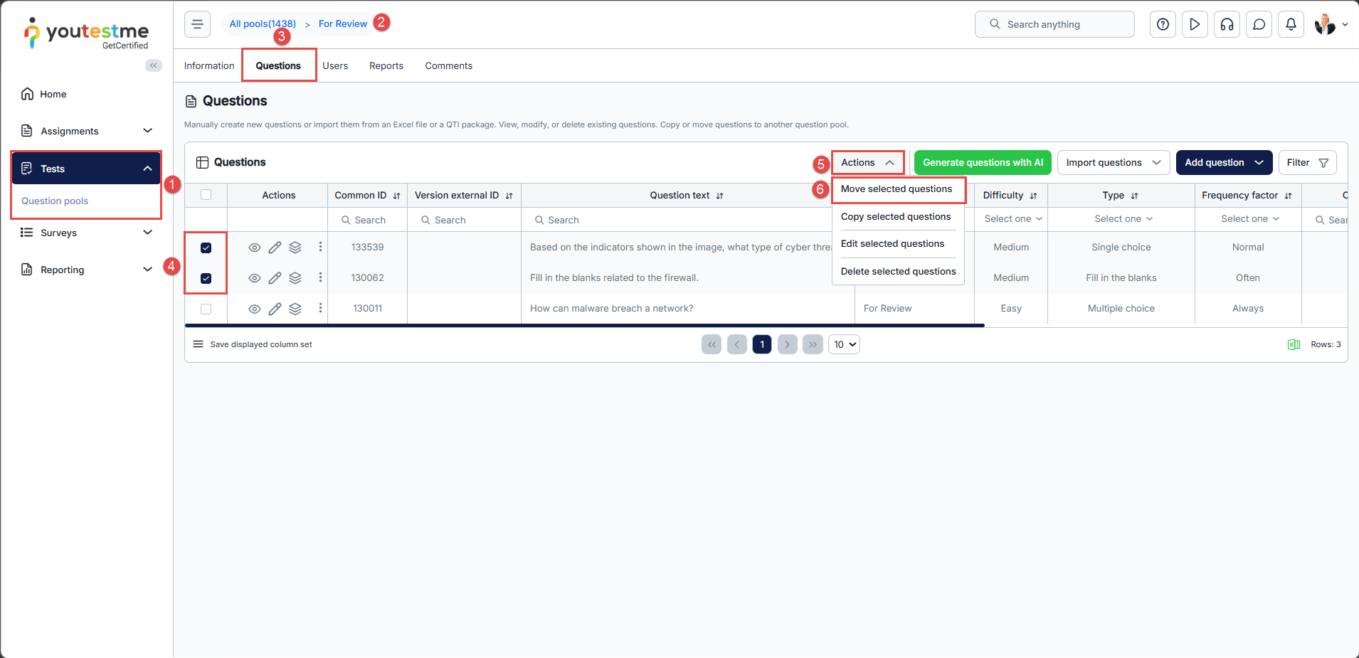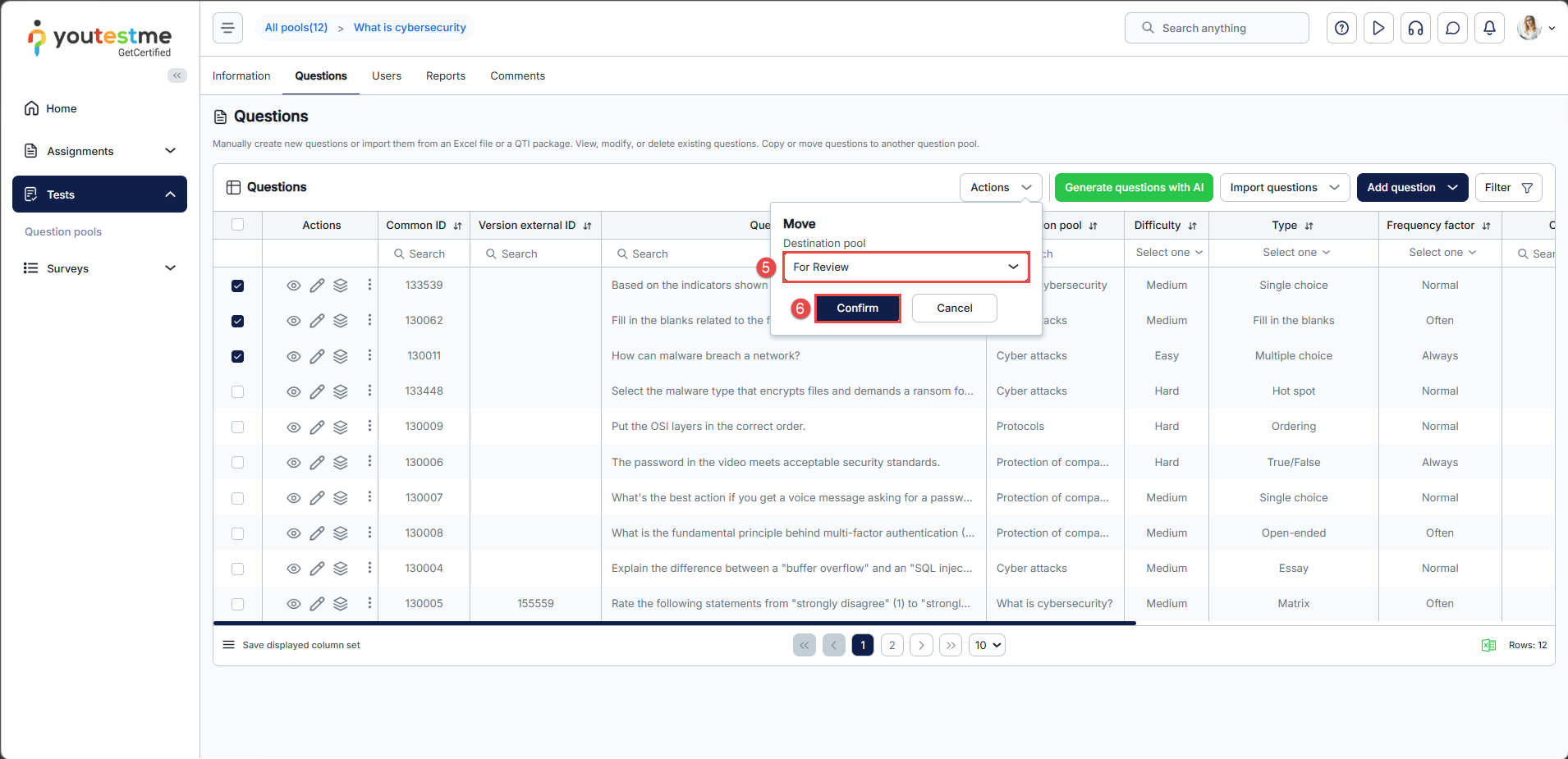 To move questions from one pool to another, follow these steps: