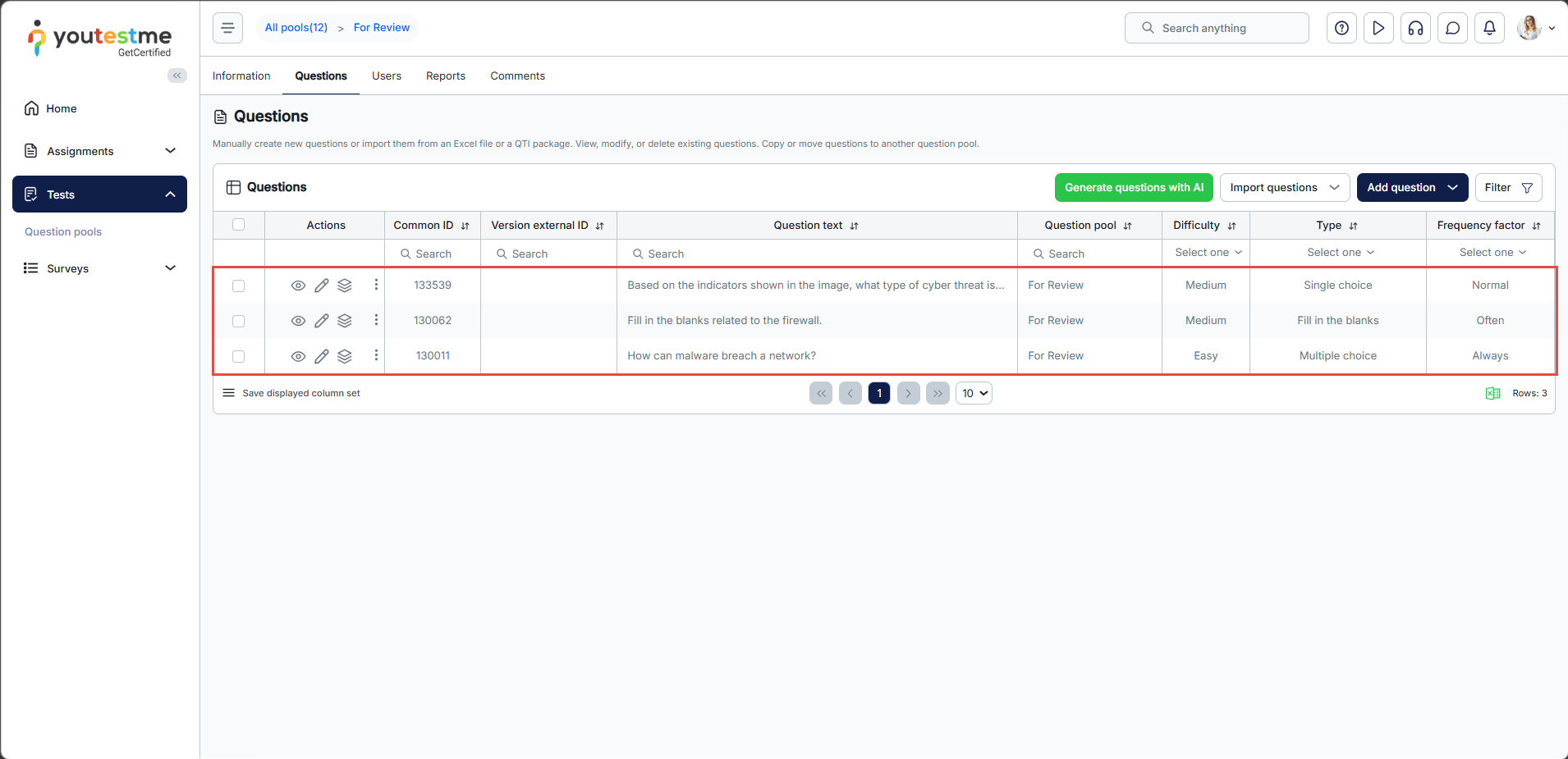 - Select the question pool For review from the dropdown list.