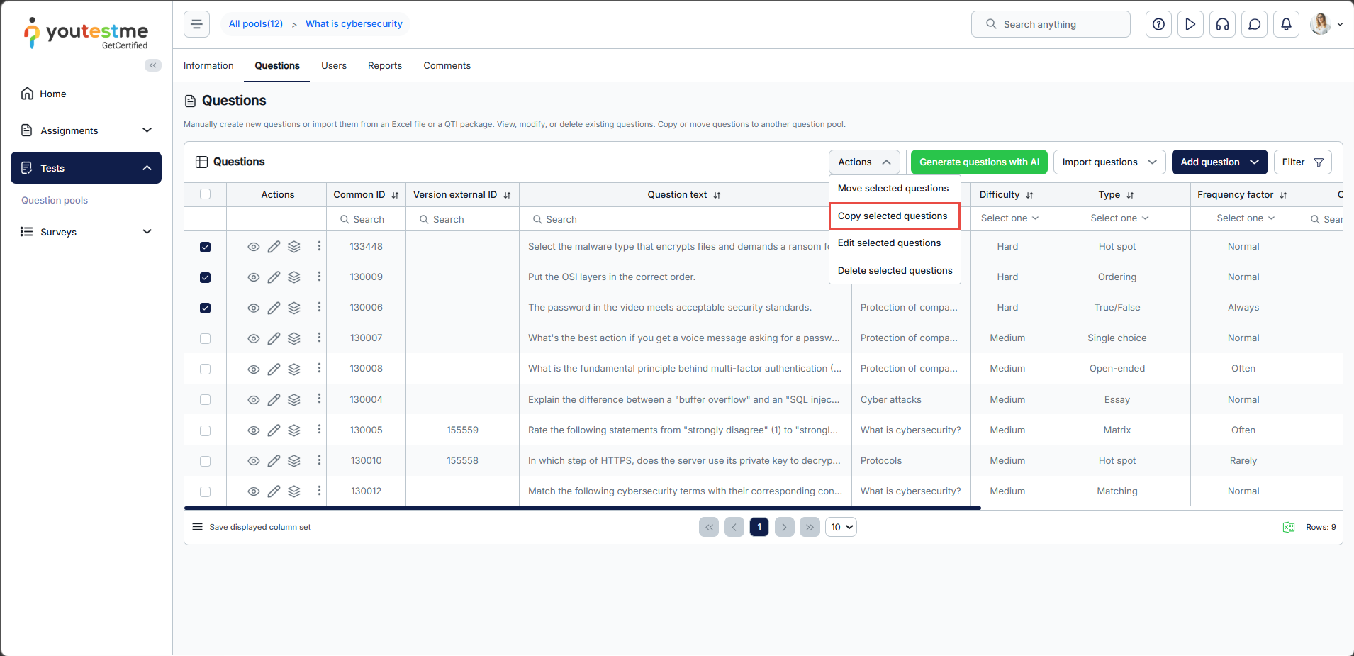 When you select questions and click the Copy button, you can copy questions from this pool to another. The process of copying questions is the same as for moving. For instructions on copying/moving questions, please visit the Moving questions chapter.