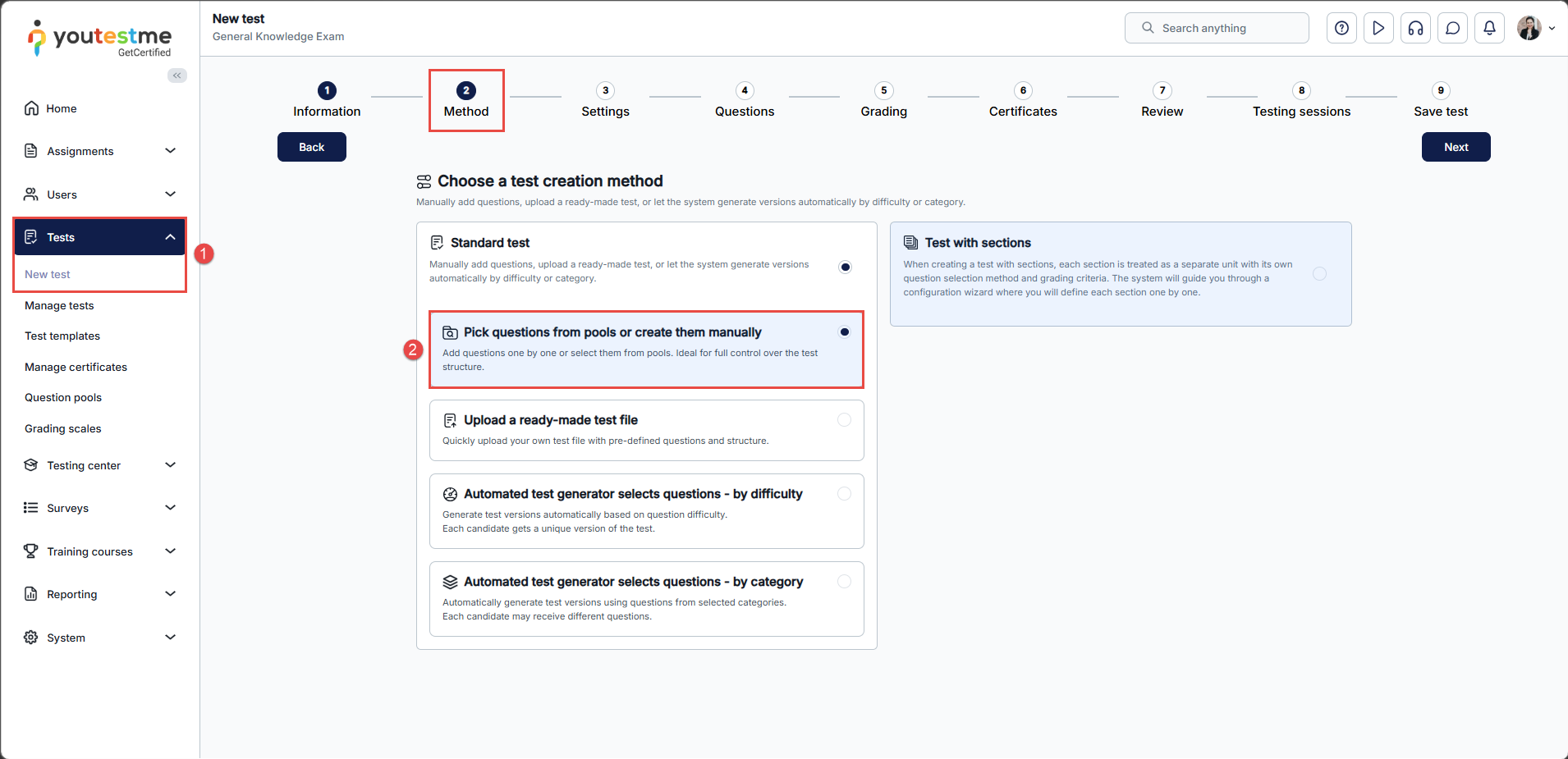 - Go through all the steps in the Create test wizard. For more information on how to create a test, please visit the How to create a simple test without sections article.