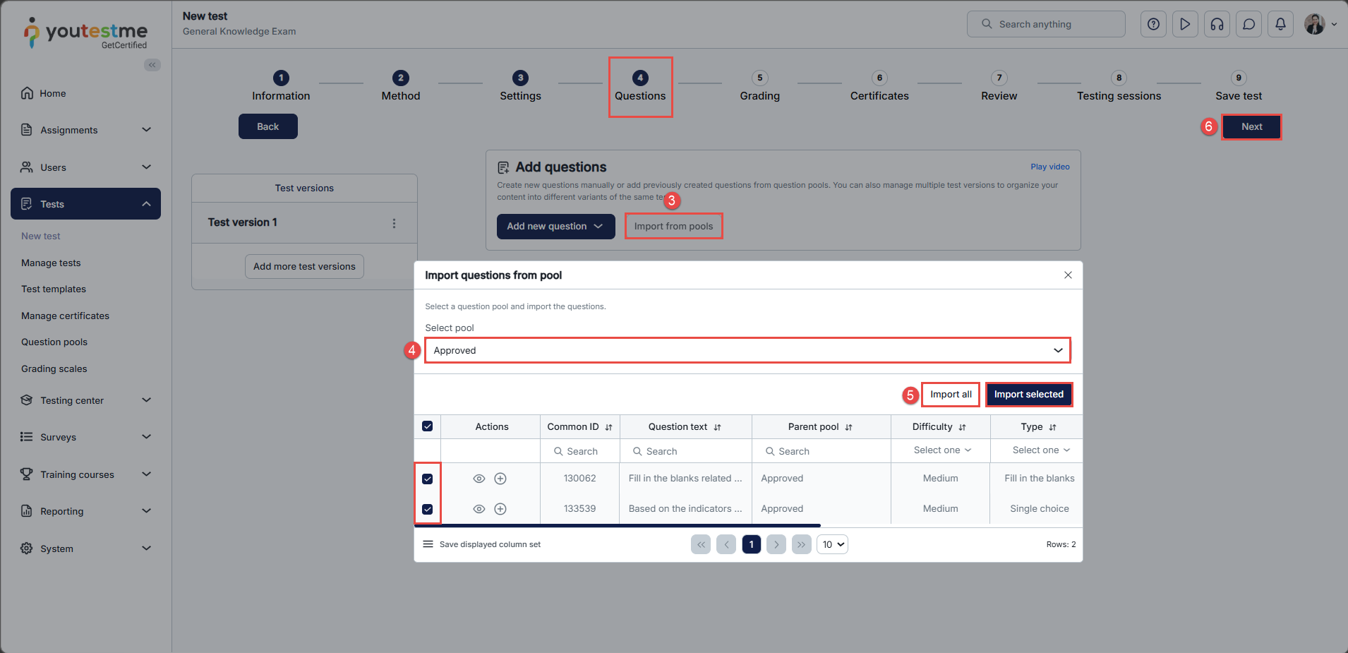 - Choose Approved question pool and assign questions you want in your test. You can also click on Assign all if you want all of the questions in your test.