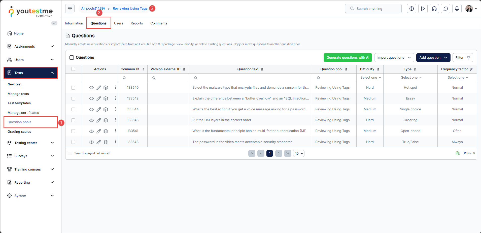 - This question pool manager can manage the question pool with tags. Click on Reviewing using tags.