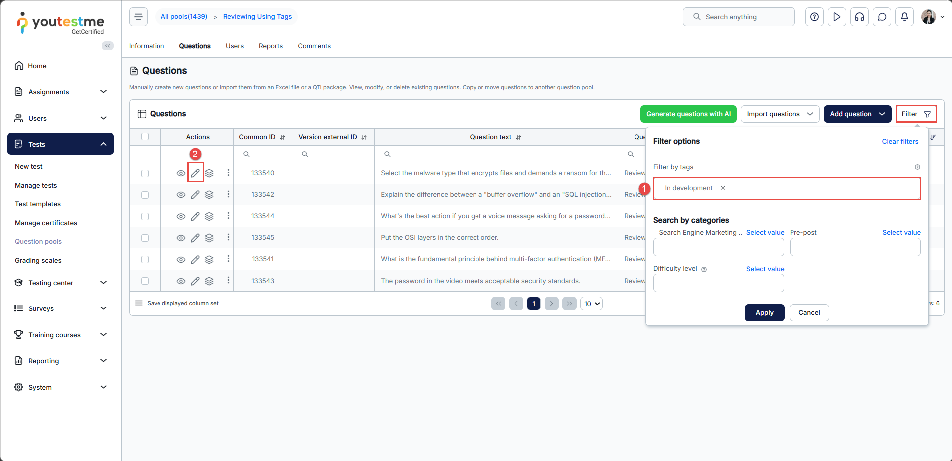 - Here you can see questions that have tags – approved, for review, and in development.
