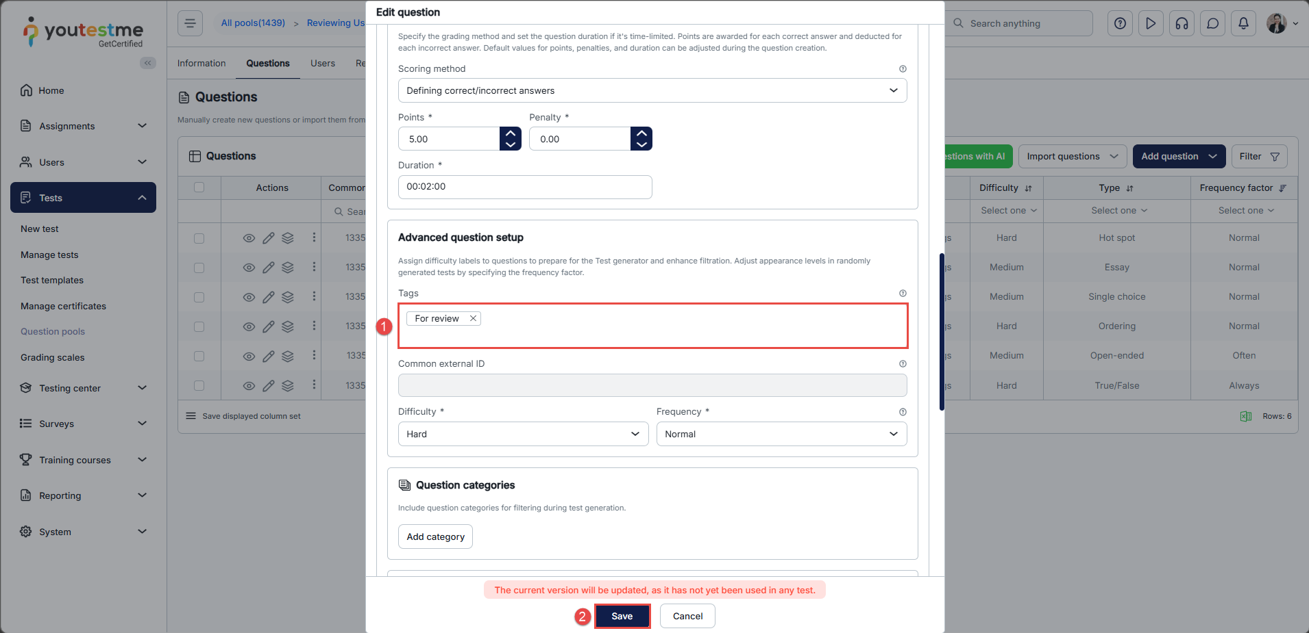 - You can change the settings of the question, and you can change its tag to For review and click Save. The question should now be moved to the For review question pool.