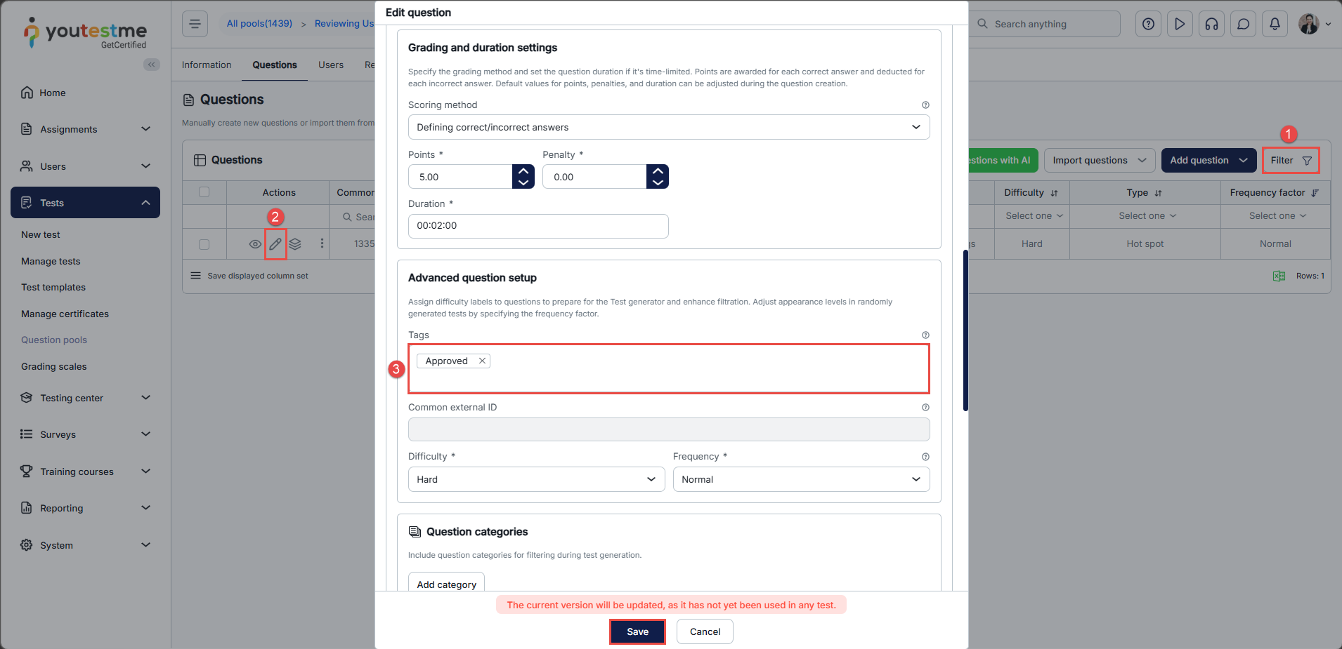 - Change the settings and tag to Approved and click on Save. The question should now be moved to the Approved question pool.
