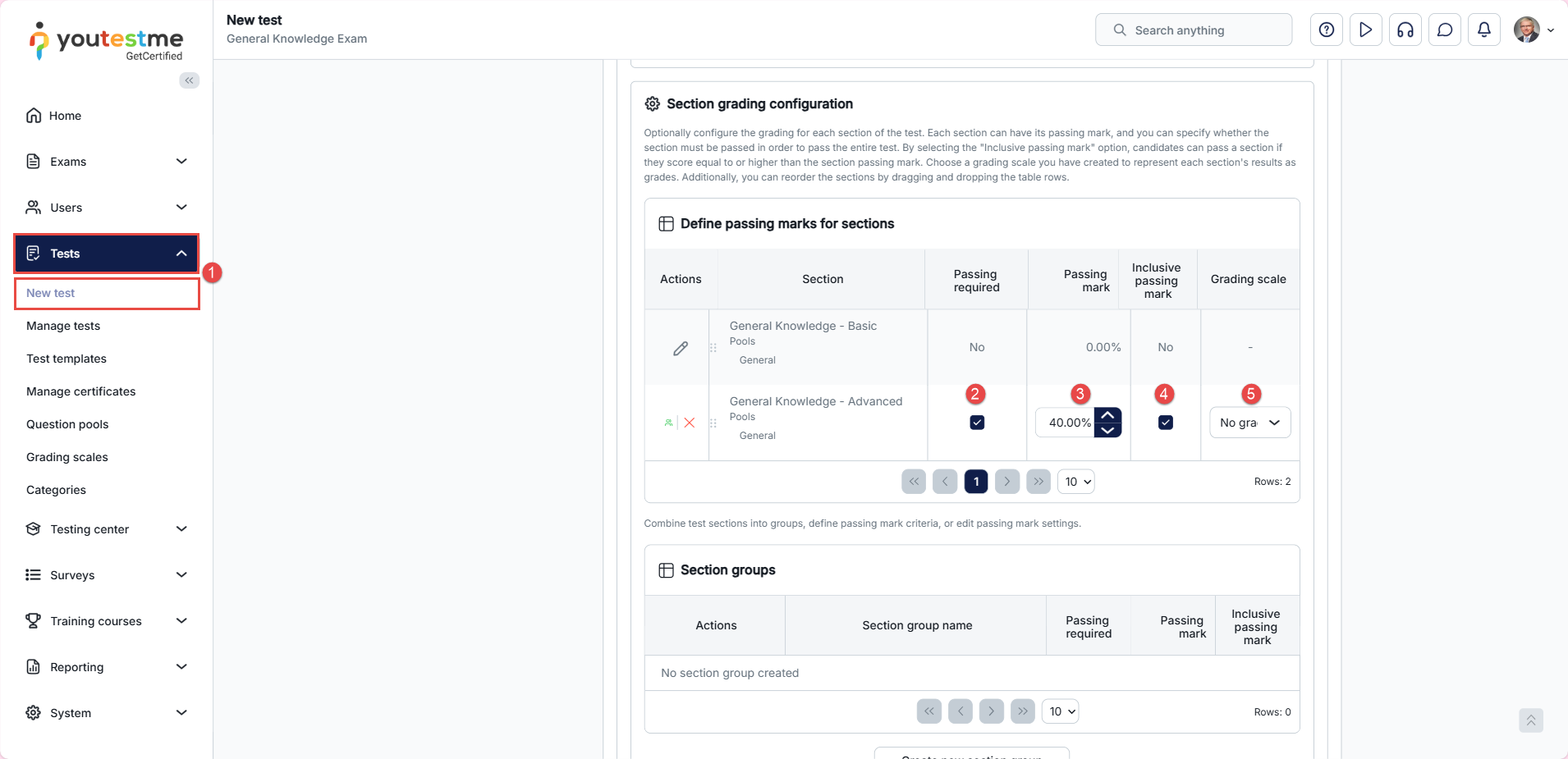 1. Expand Tests, then select New Test. In the Test Creation Wizard, go to Step 5 and define the grading configuration for each section. You can customize the grading rules per test section.