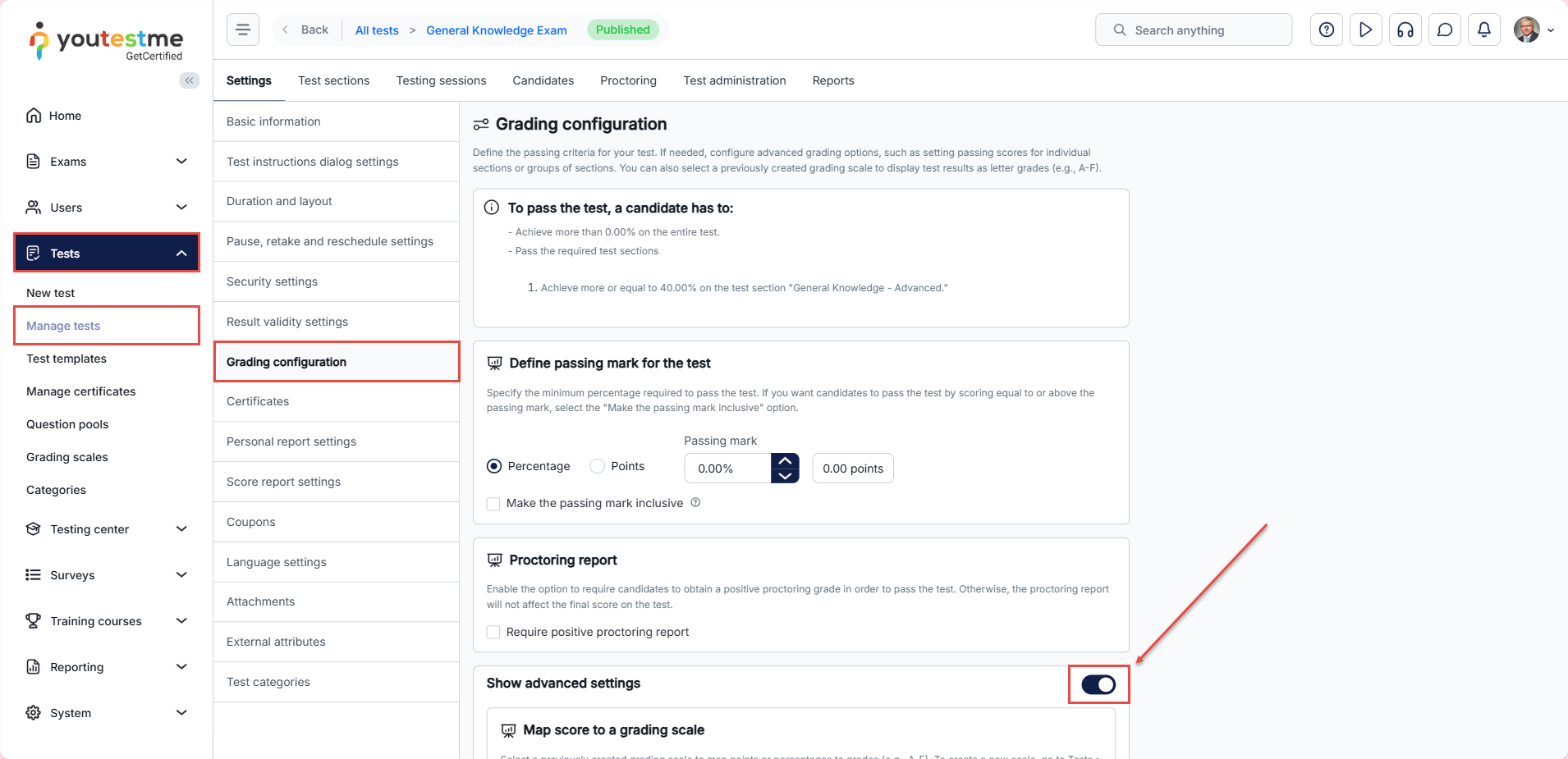 Additionally, you can adjust the grading settings at any time from the Tests/Manage tests/Grading configuration tab.