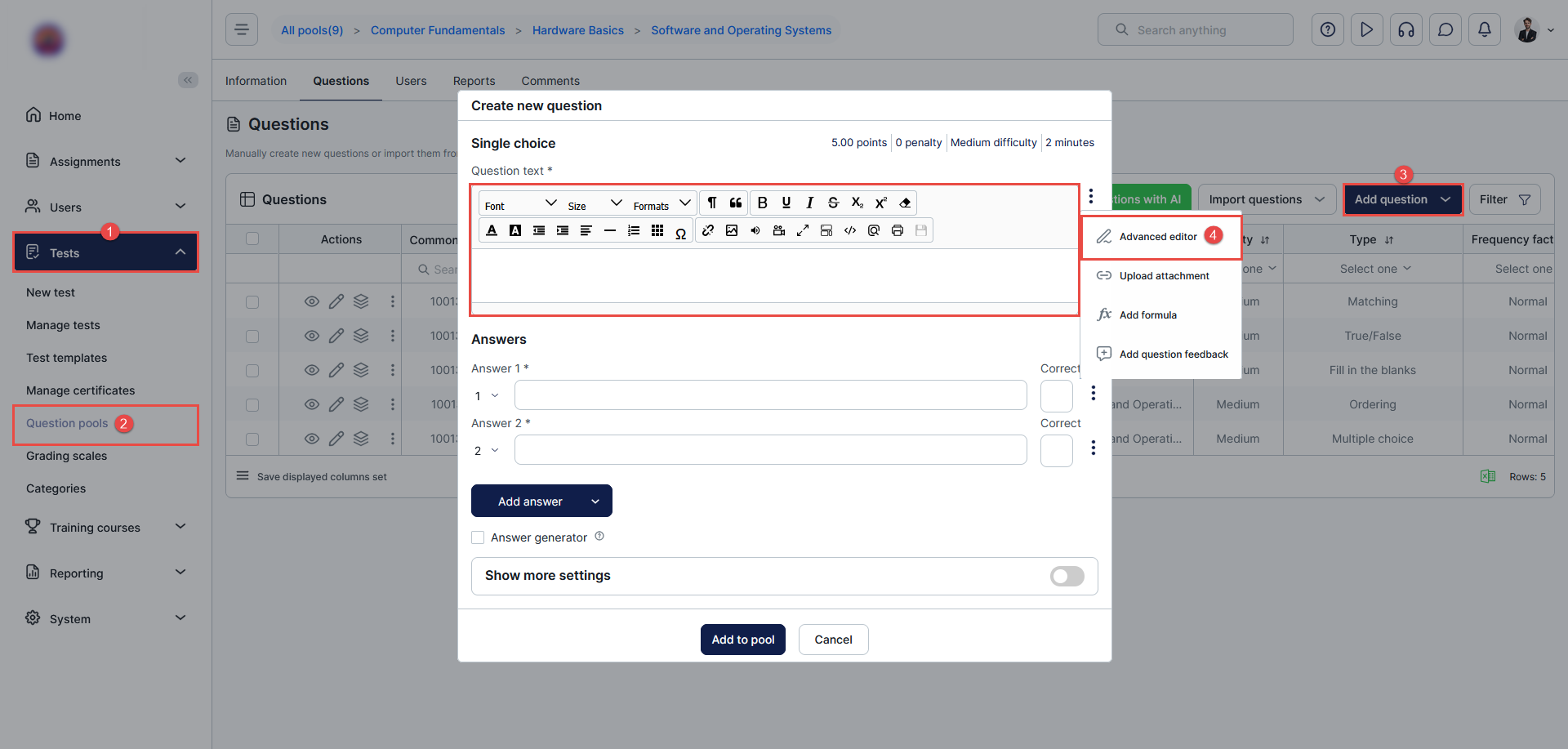 Choose a Pool & Add Question: Select the desired pool, then click the “Add question” button and choose the question type (e.g., single choice).
