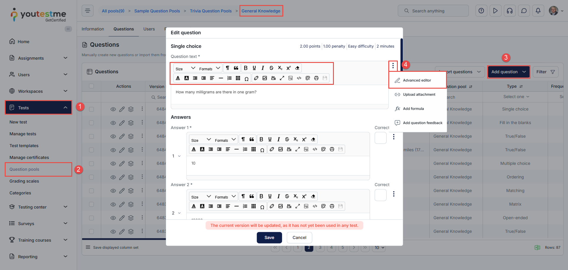 The advanced editor in YouTestMe GetCertified allows you to create rich, interactive content for questions, answers, translations, and feedback. This guide explains how to use the editor’s features to format text, insert media, and enhance your content.