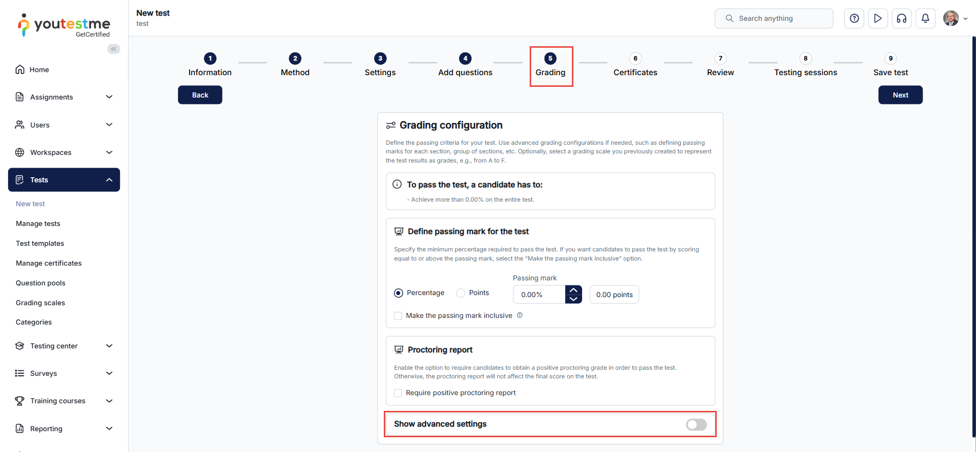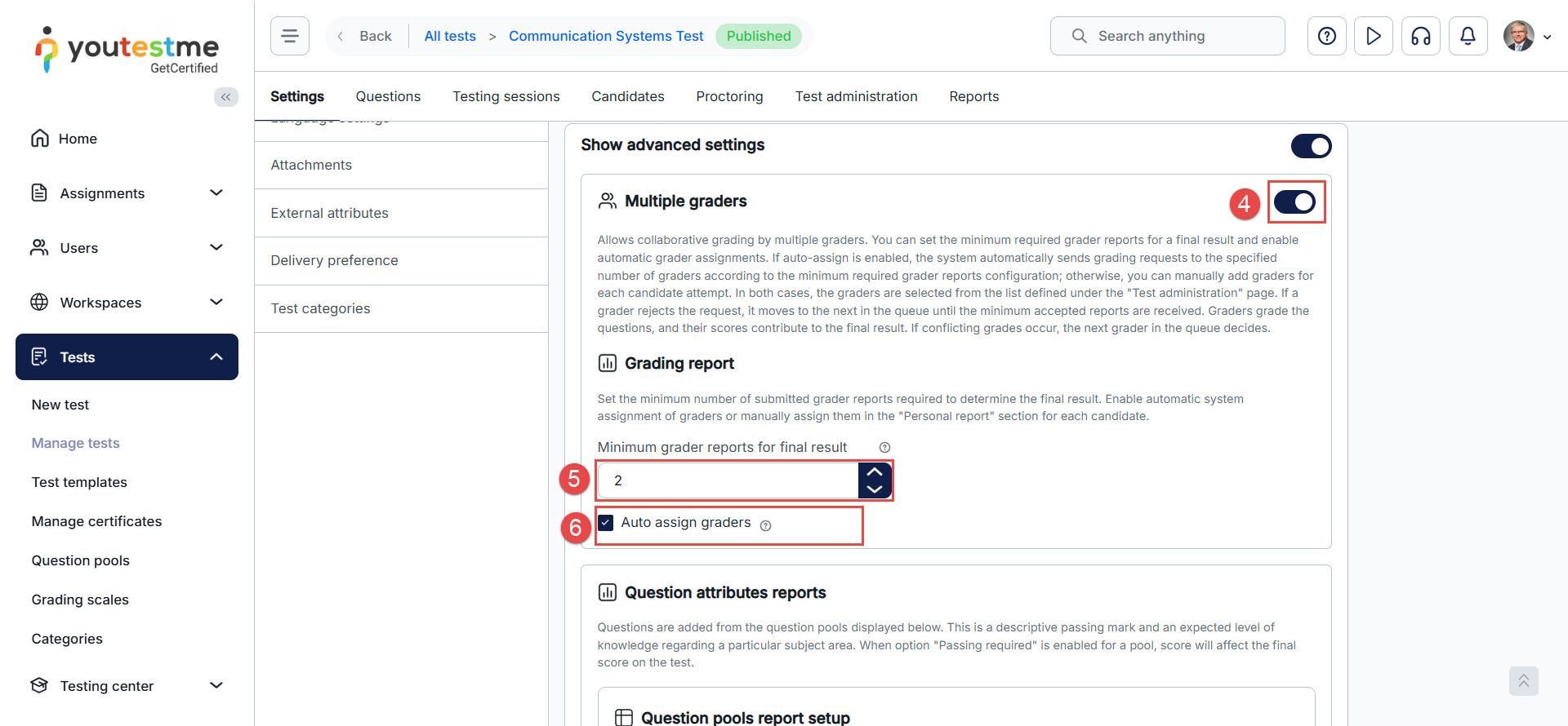 To allow multiple graders to assess the finished attempts, the Multiple Graders feature should be enabled. This can be done either during test creation or from the settings of an already-created test.