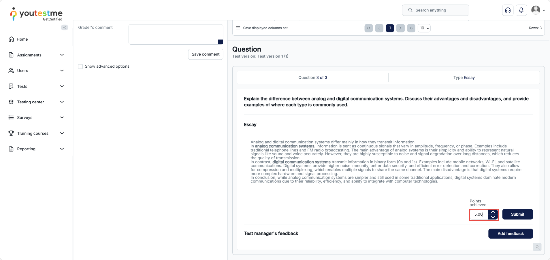 Subjective assessments, such as writing exams or project evaluations, often require multiple perspectives to ensure a fair and comprehensive evaluation. Recognizing this need, YouTestMe provides a robust feature that allows multiple graders to collaboratively assess a single attempt, enhancing accuracy and reducing bias in grading.