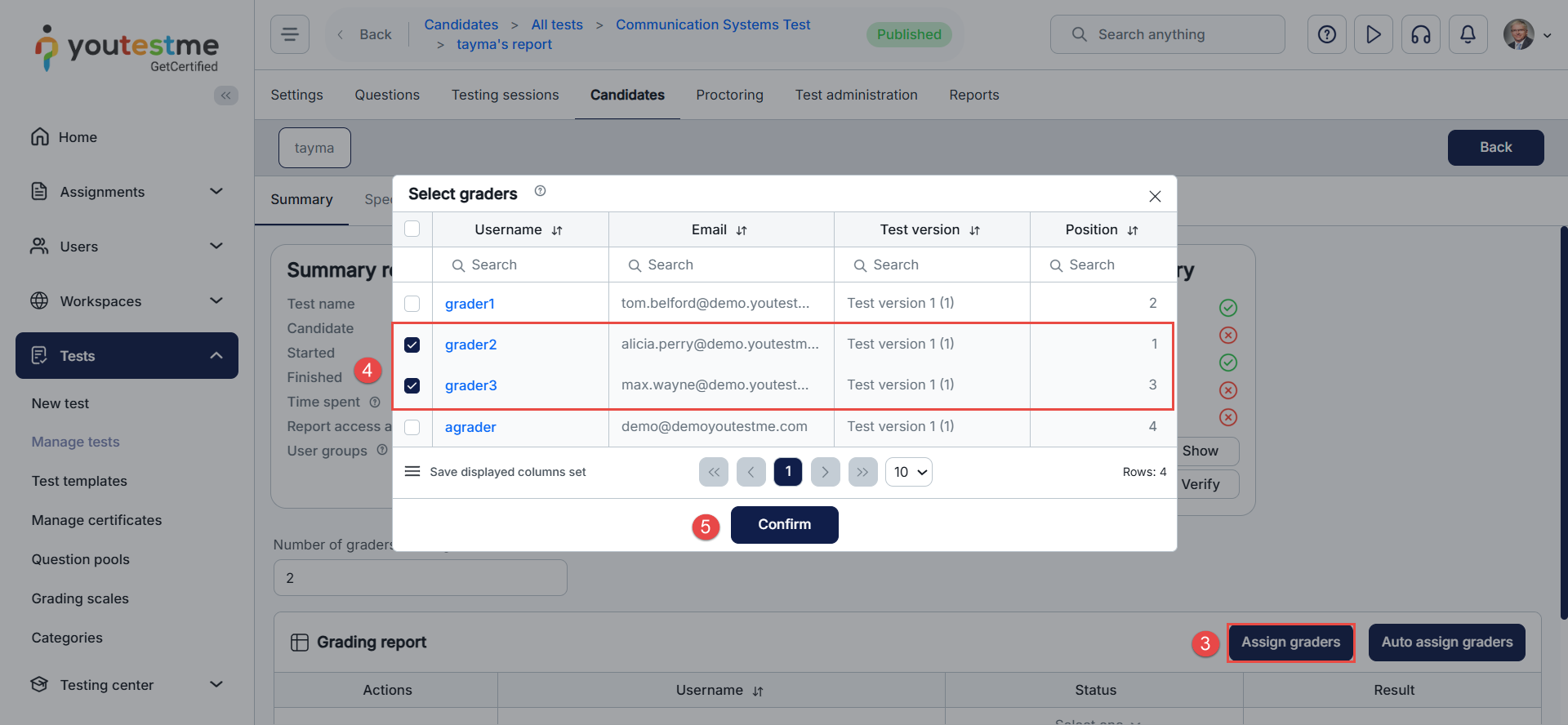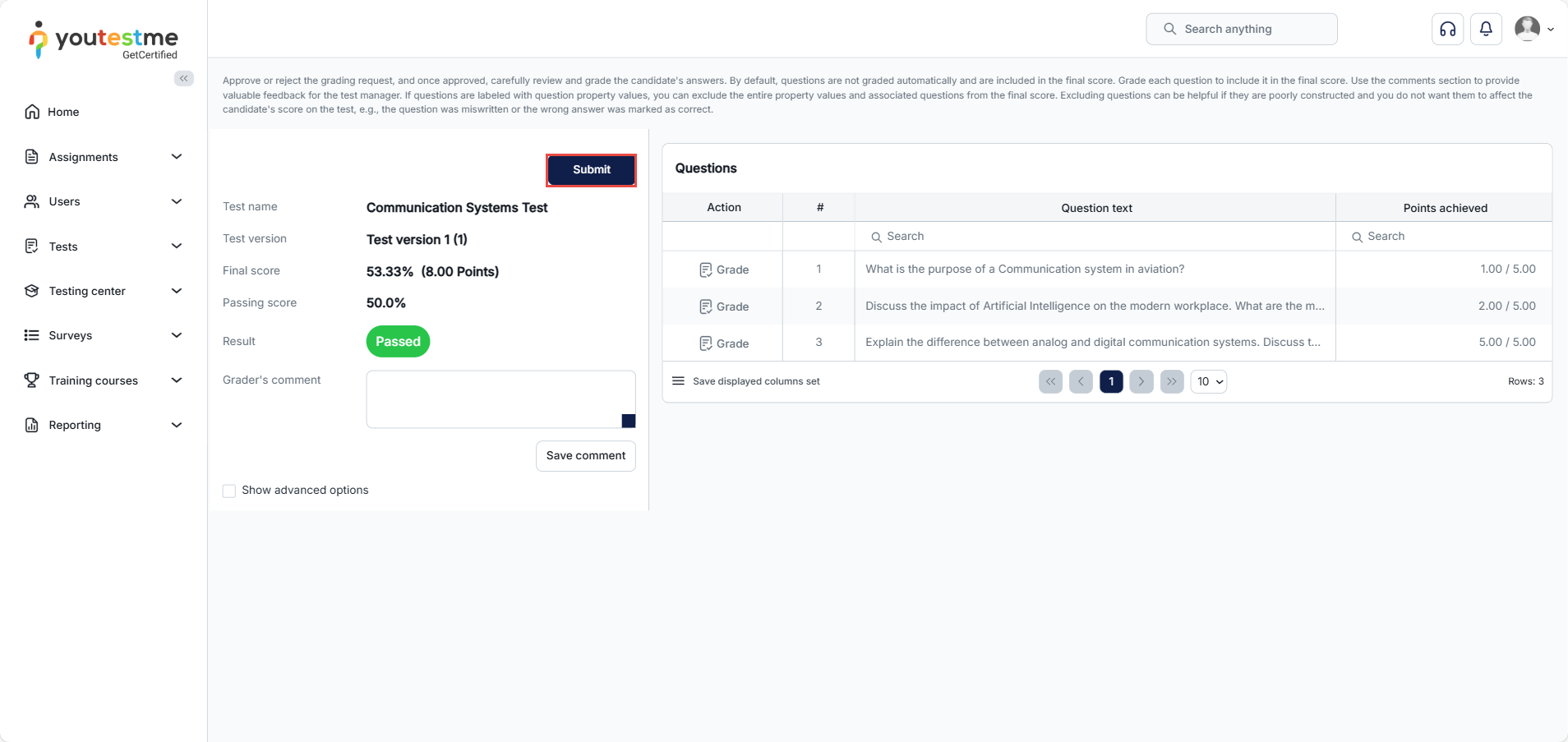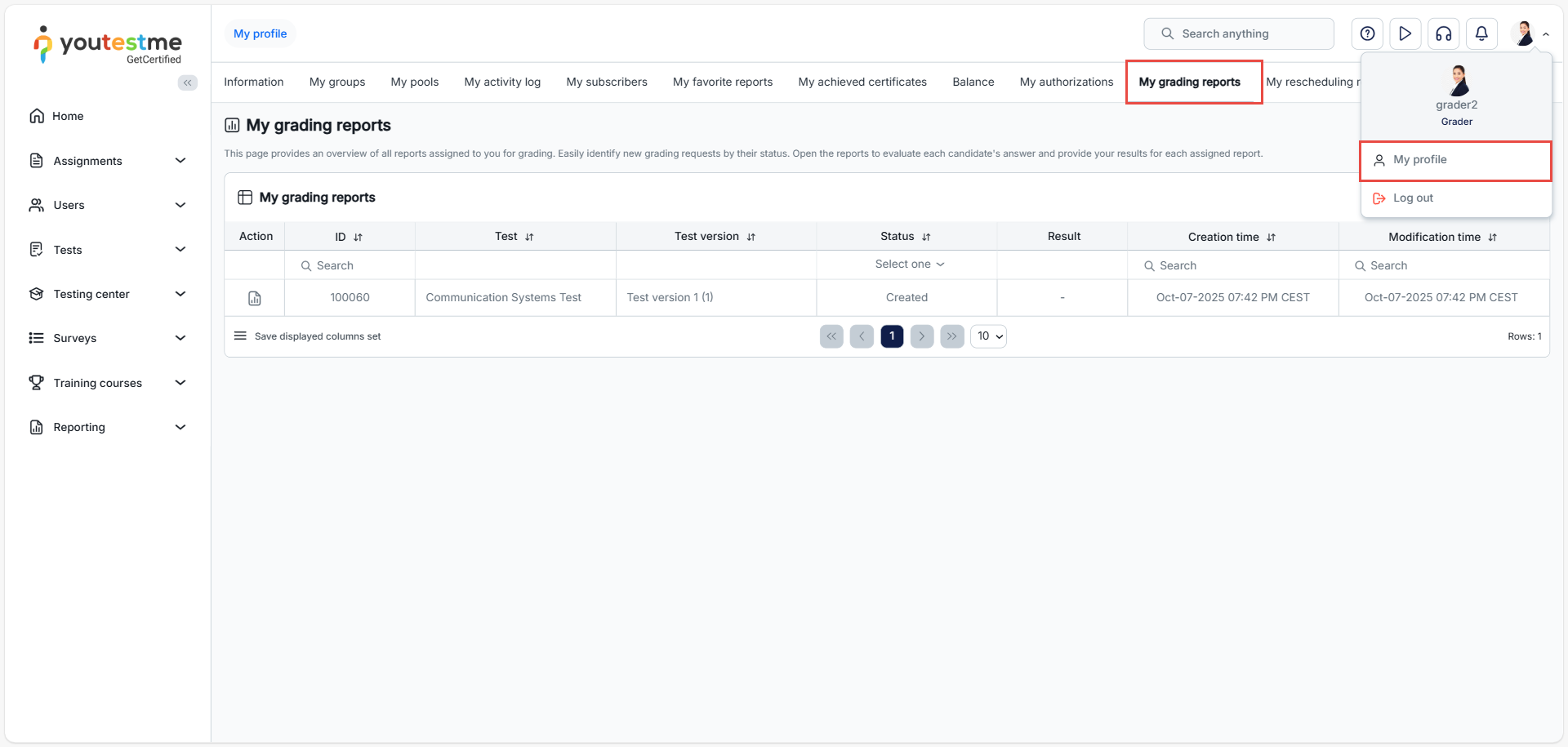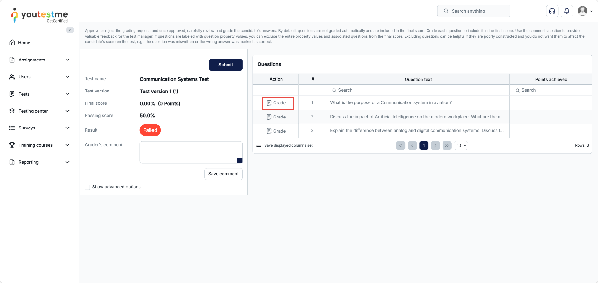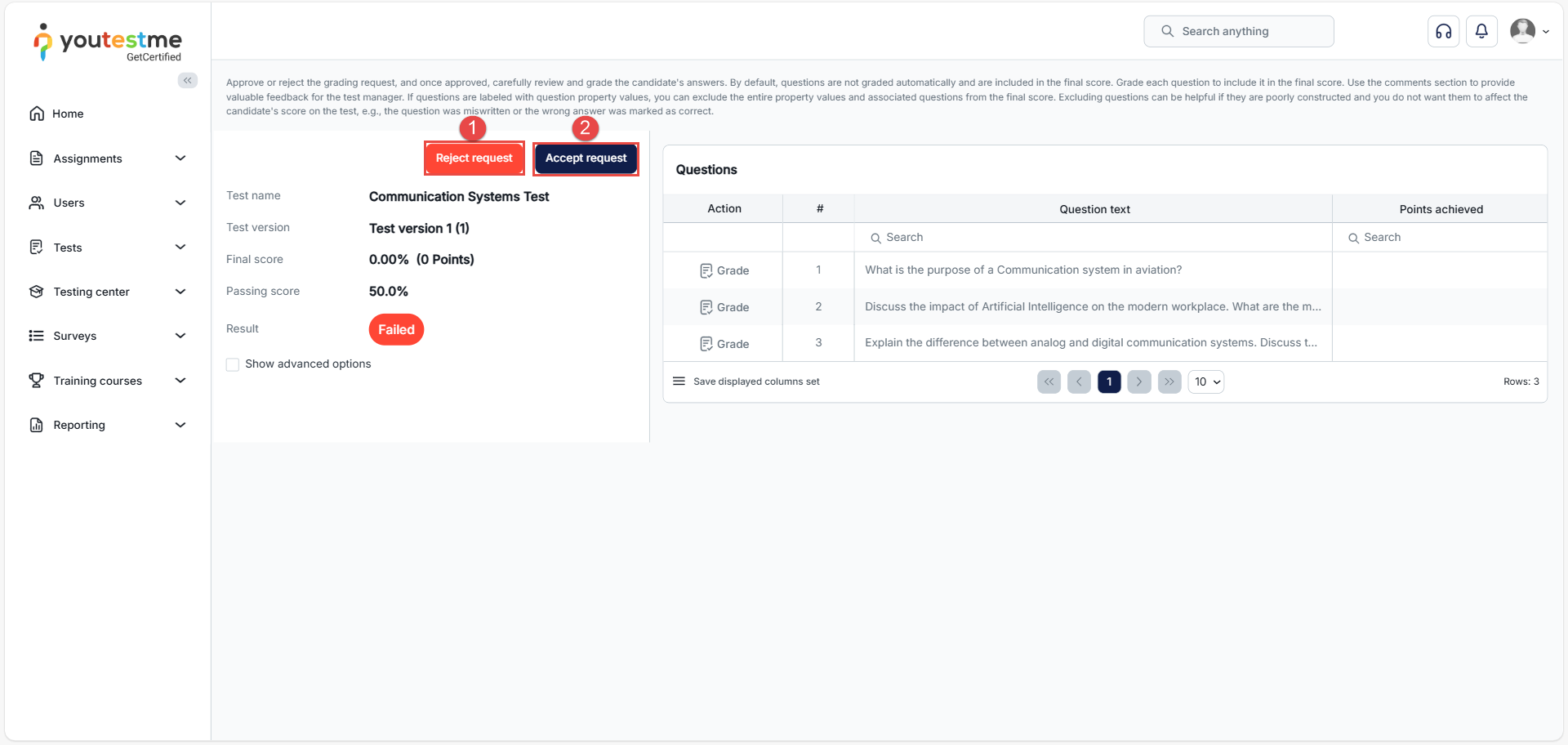 Graders must be assigned to the test to receive grading requests and evaluate the finished attempts.