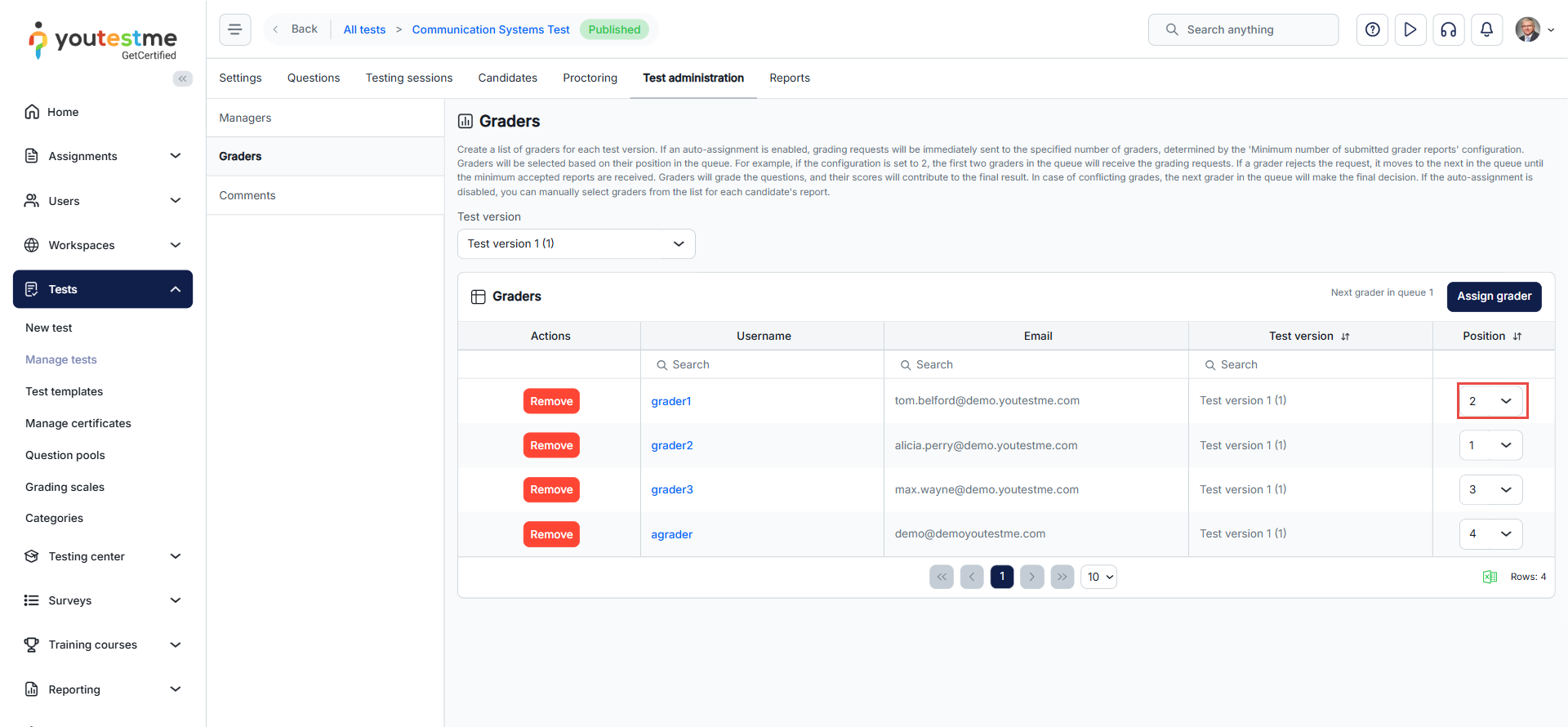 The list of assigned graders will be displayed. You can set the order of graders, which the system will respect when auto-assigning graders. For example, if the minimum number of graders is set to three, the system will invite graders 1, 2, and 3. Grader four will be automatically invited if one of these graders rejects the invitation.