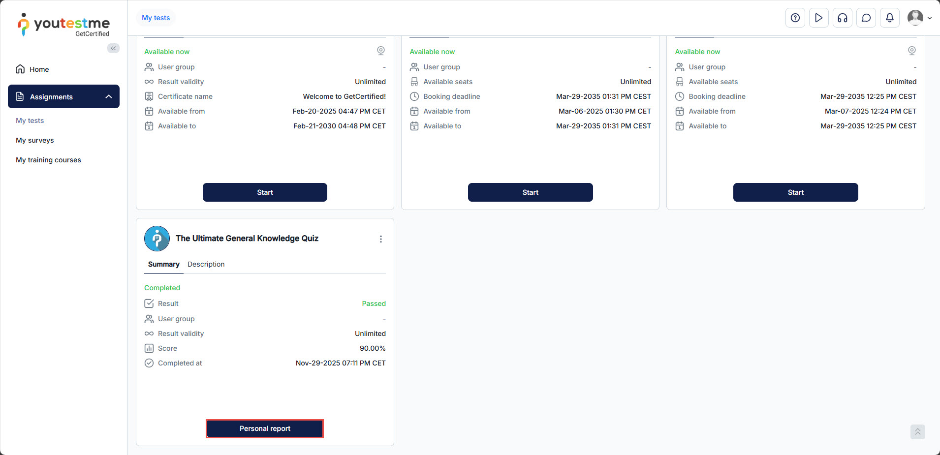 After completing the test, if the candidate can access the Personal report, they can click the Personal report button to view the details.