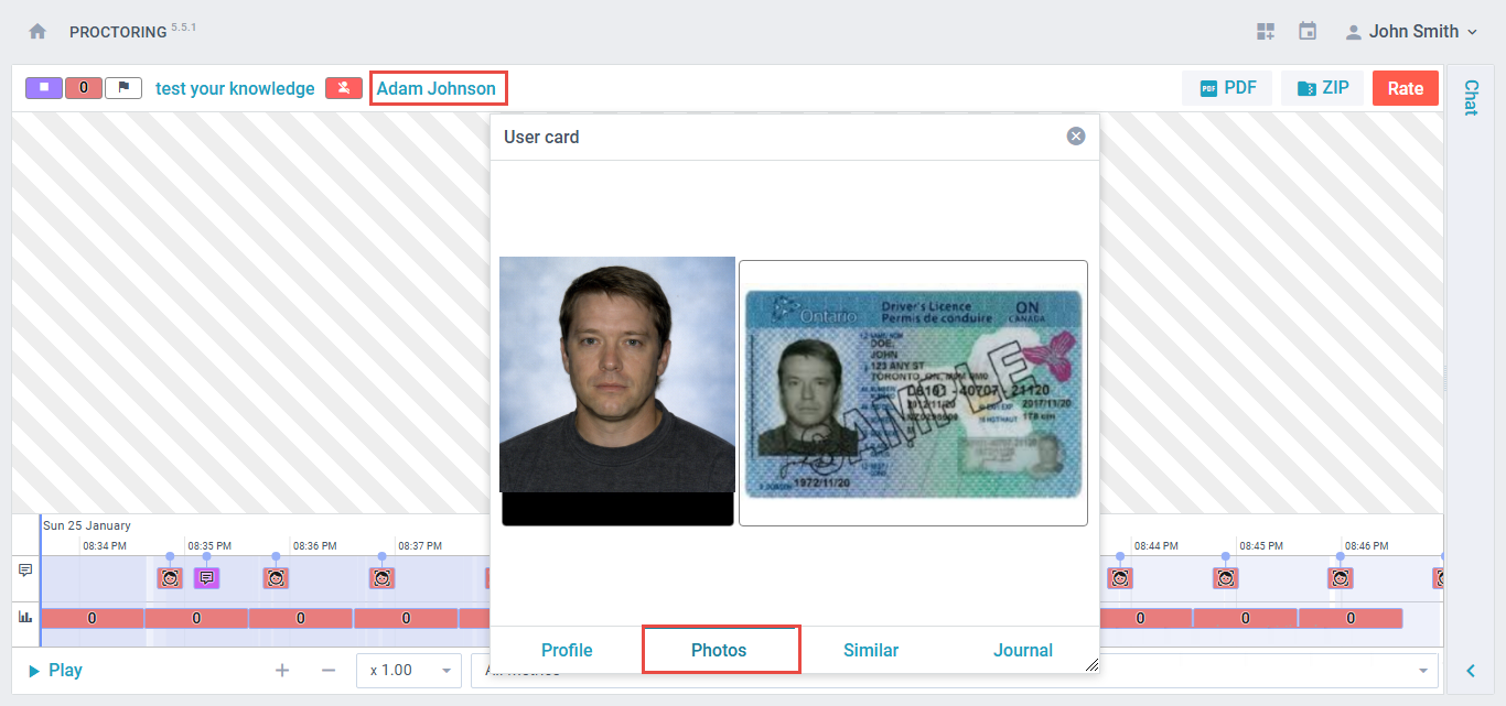 The submitted ID can be accessed by clicking the test-taker’s username within the exam recording on the Supervision tab.