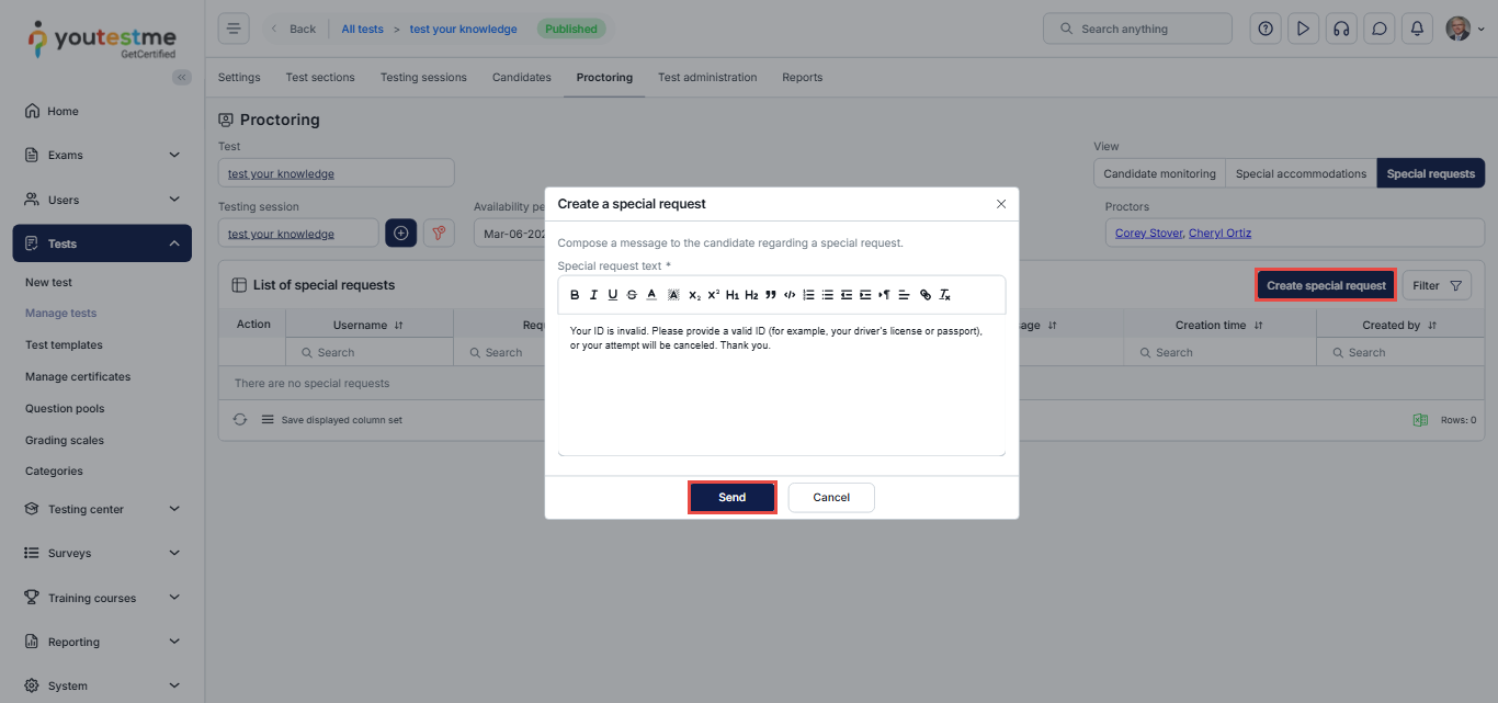 If the ID is deemed invalid, the proctor uses the Special Request feature to request a valid photo of the ID.