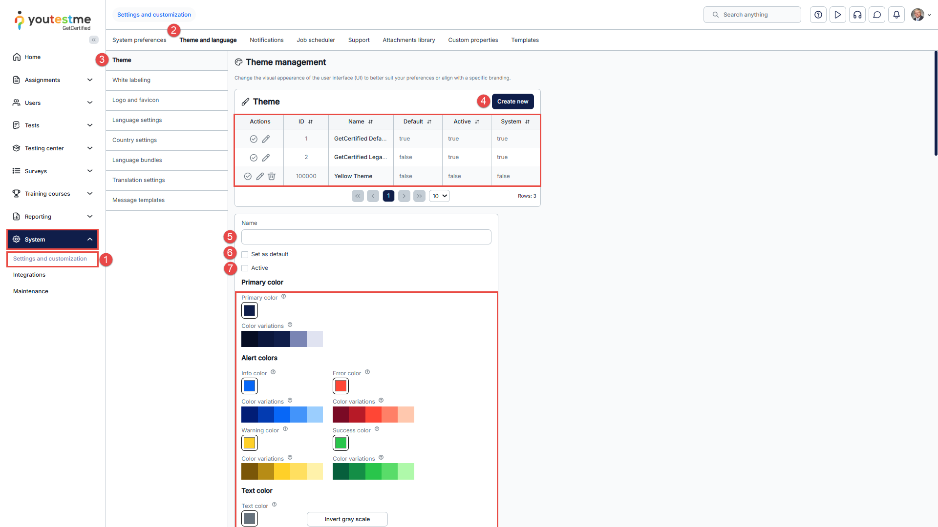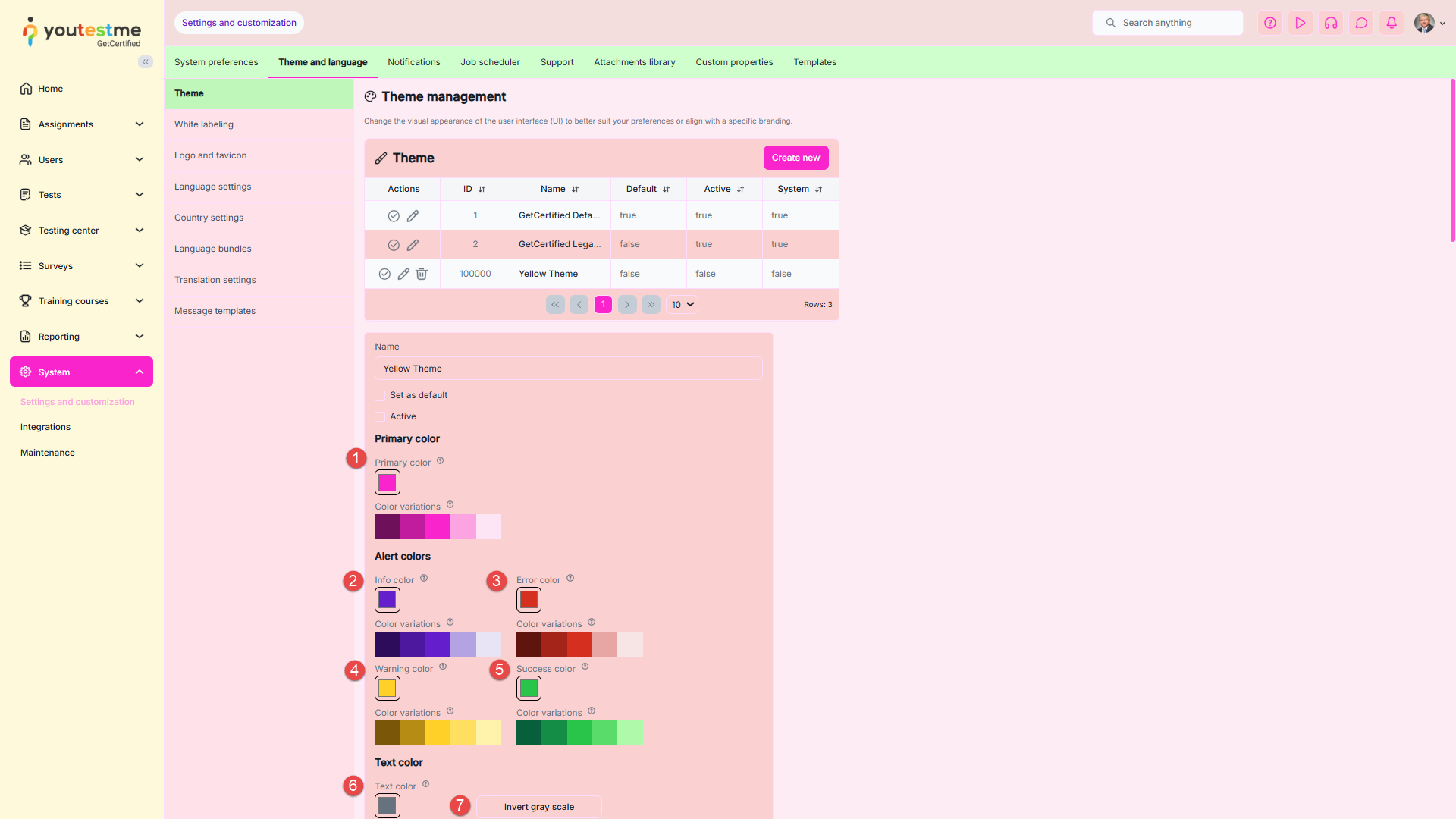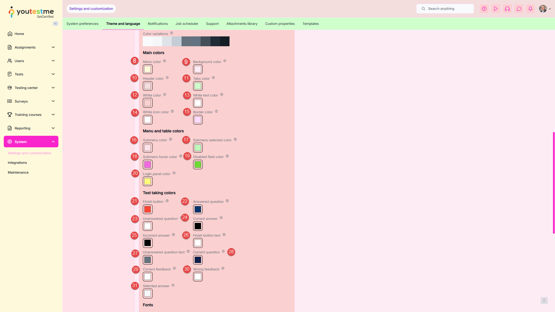 - Change success color – The color used to indicate important labels (e.g., the Passed label on tests or testing sessions that are currently available) or actions (such as the Start button on the My tests page, Test preview action, etc.).