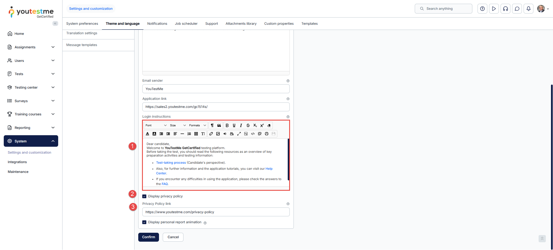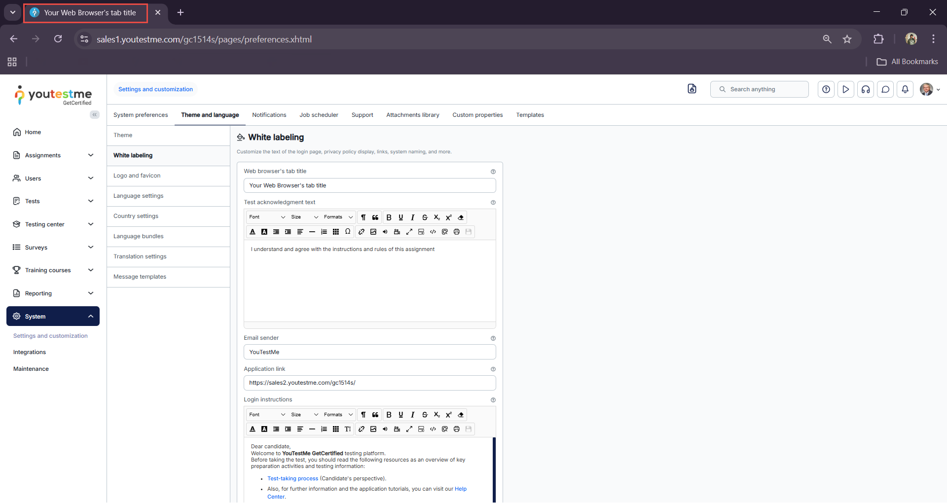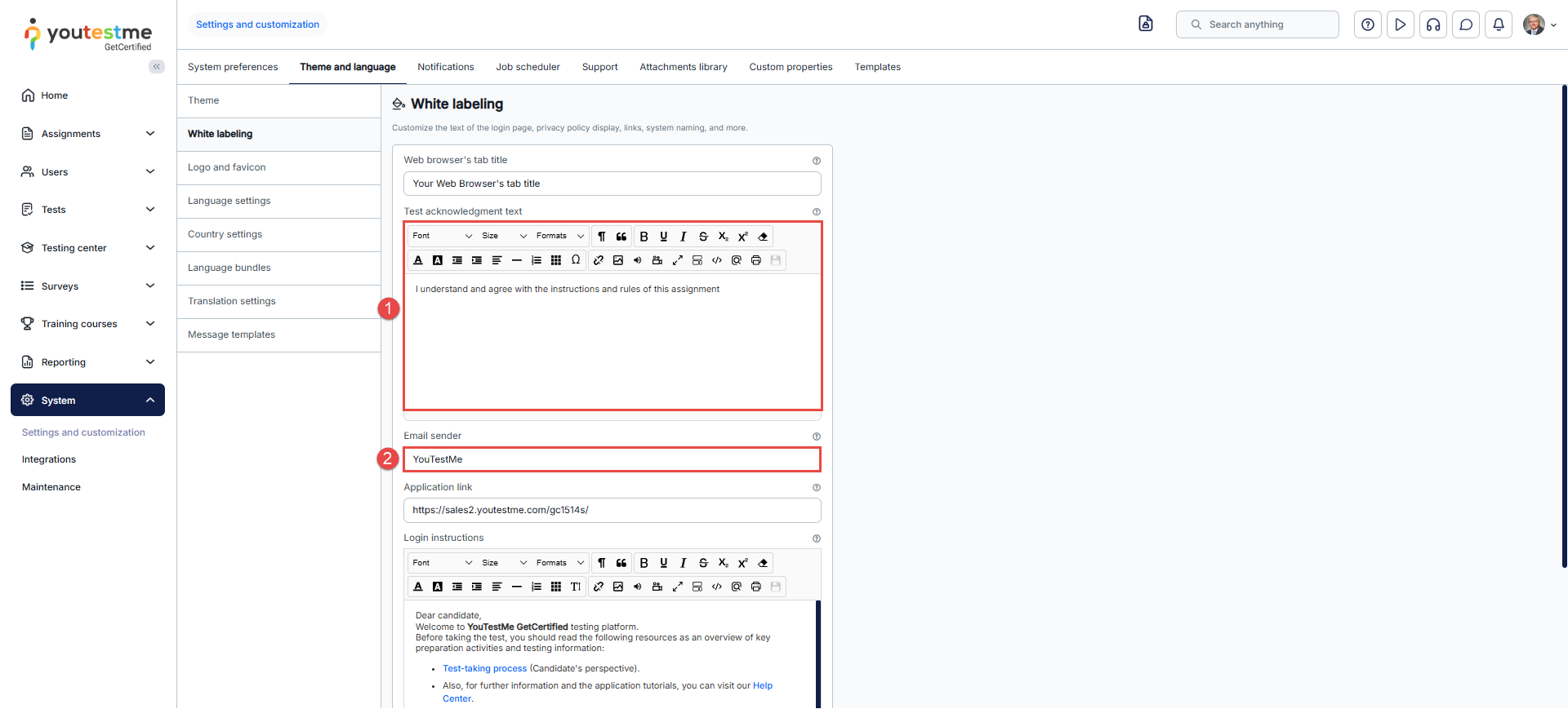 In the white labeling module, you can also customize the signature to be displayed in the email notifications sent to users by the system, as well as the confirmation label that candidates will see when accepting the exam instructions.