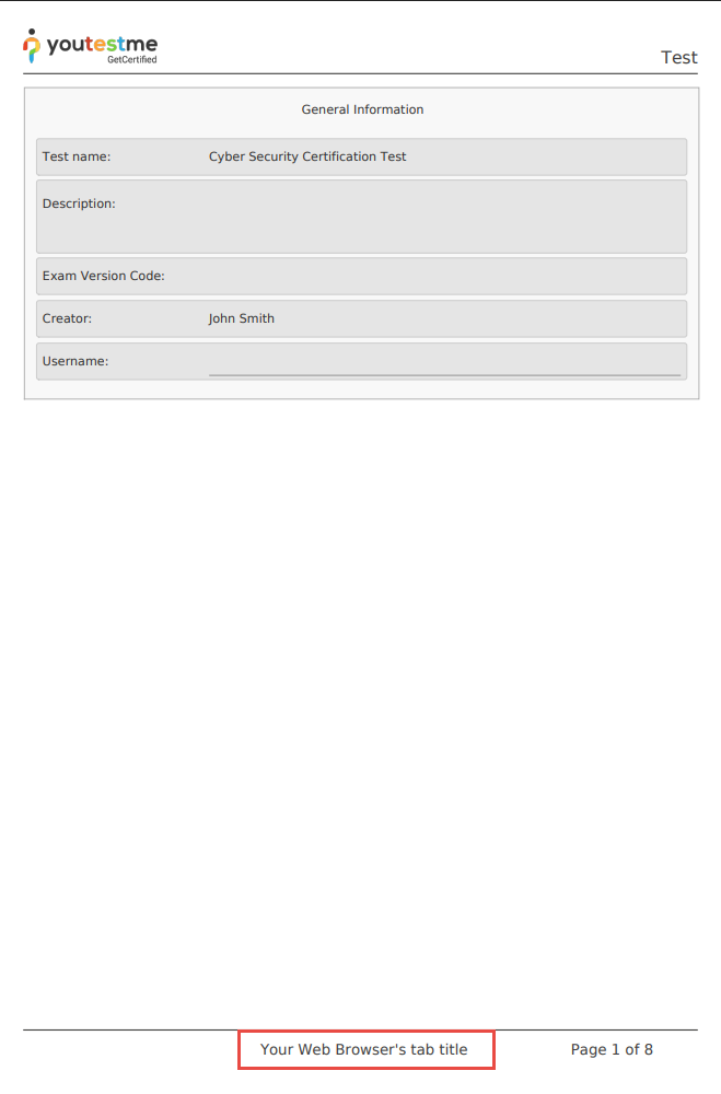 Please note that if you export the exam in PDF format, the web browser’s tab title will be shown in the PDF footer.
