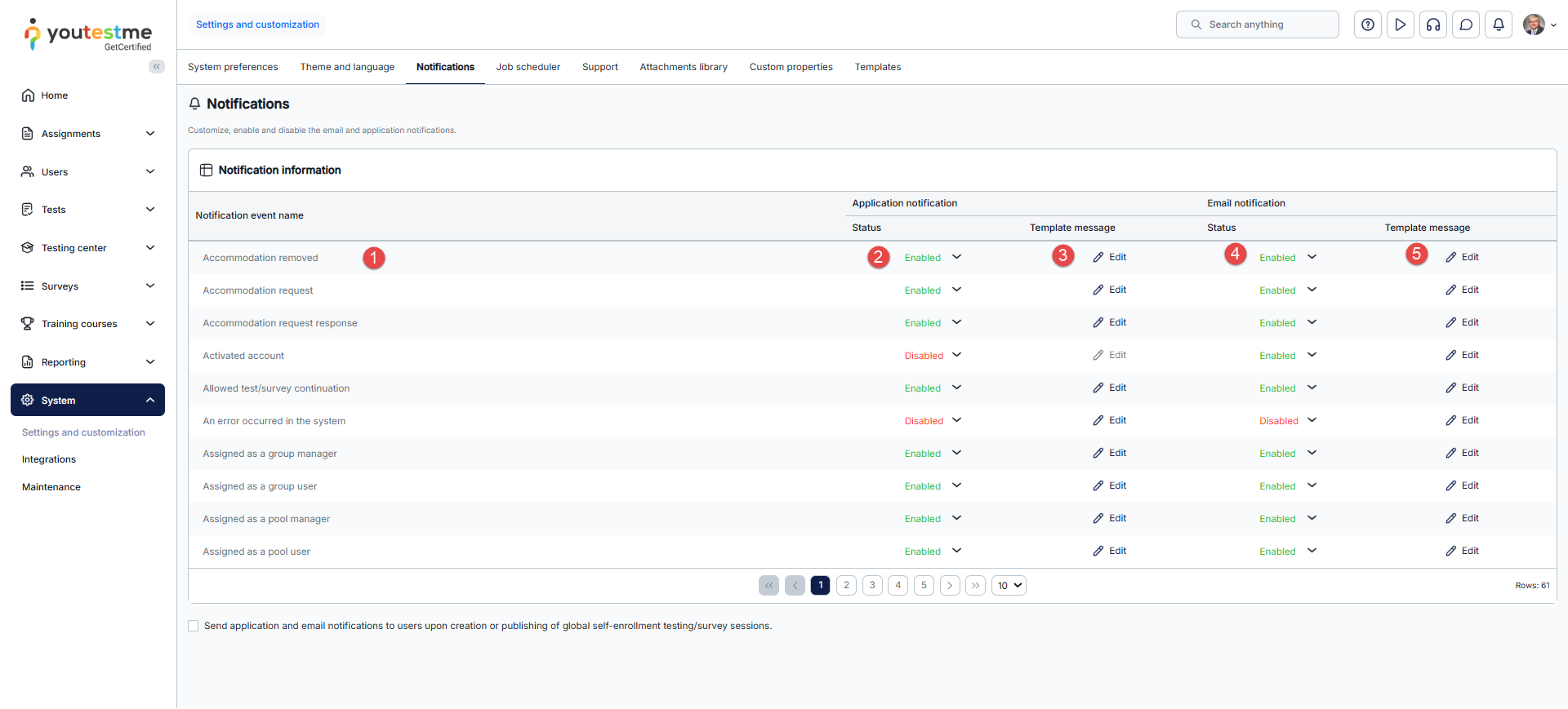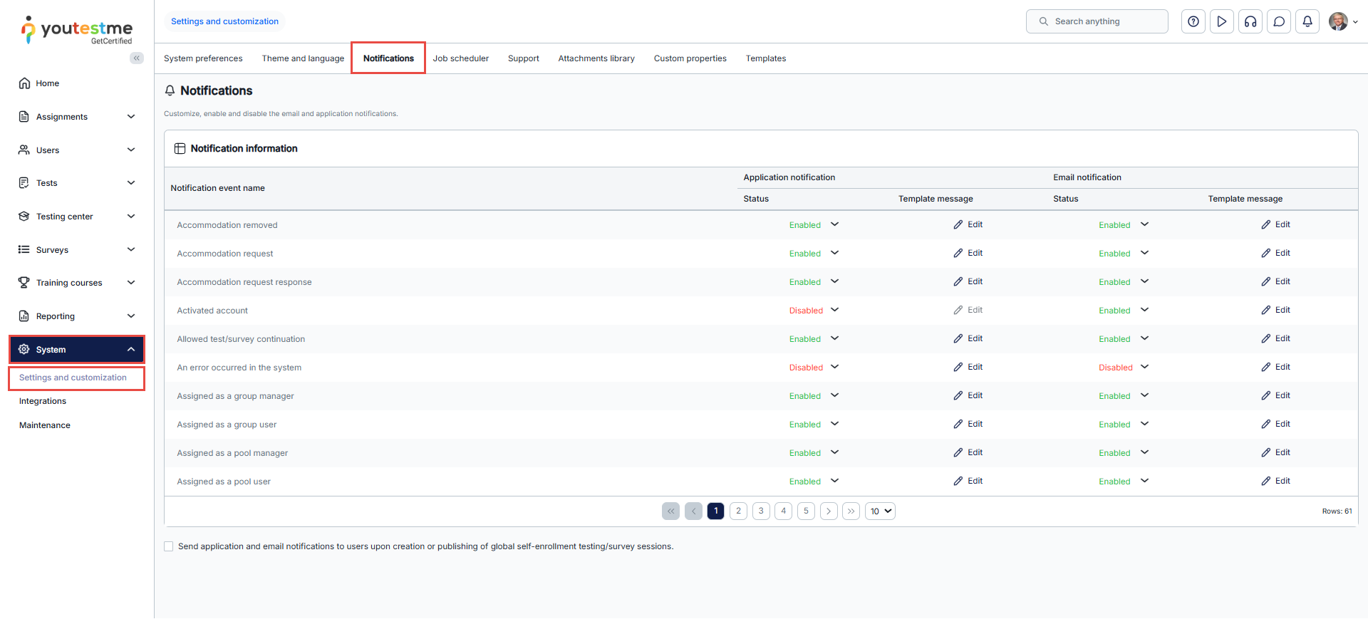 - Click on Edit to customize Email notifications – edit the template message sent to users’ email after a specific action is taken.