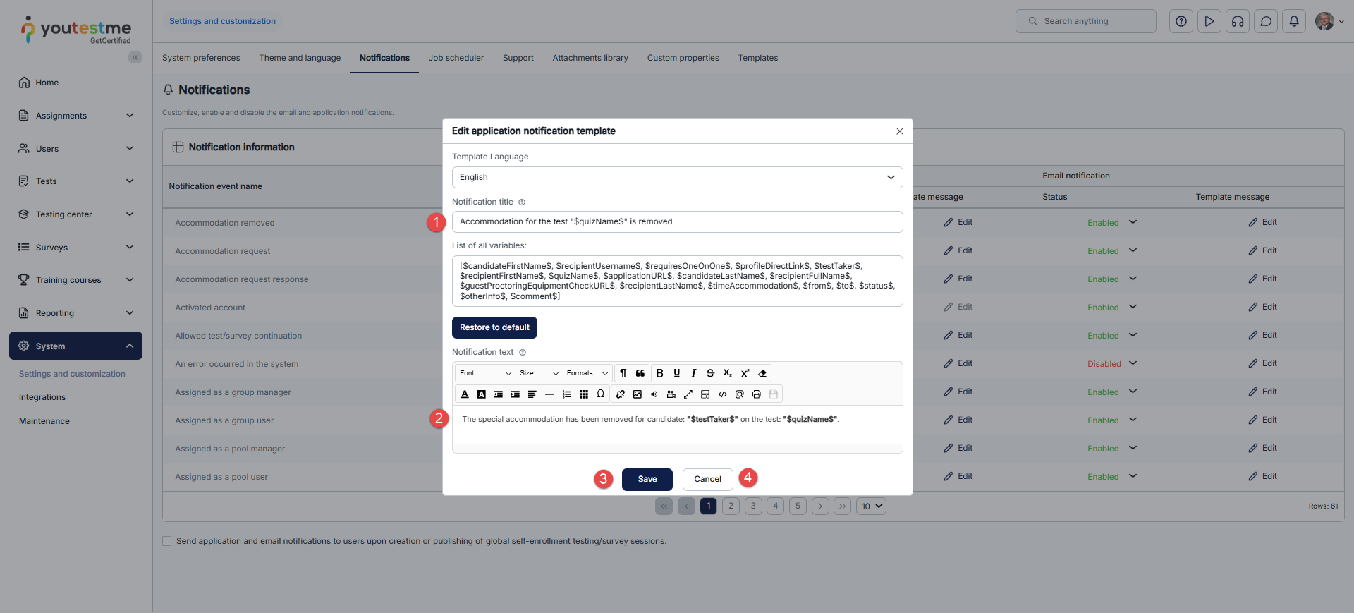 Notification templates are predefined but editable. To manage and edit notifications, follow the instructions below: