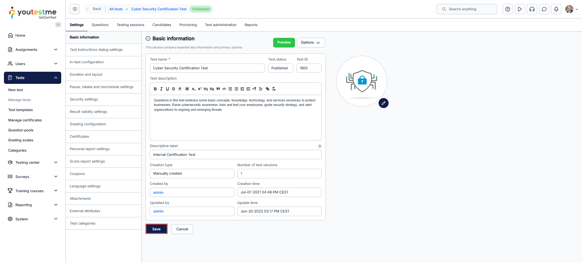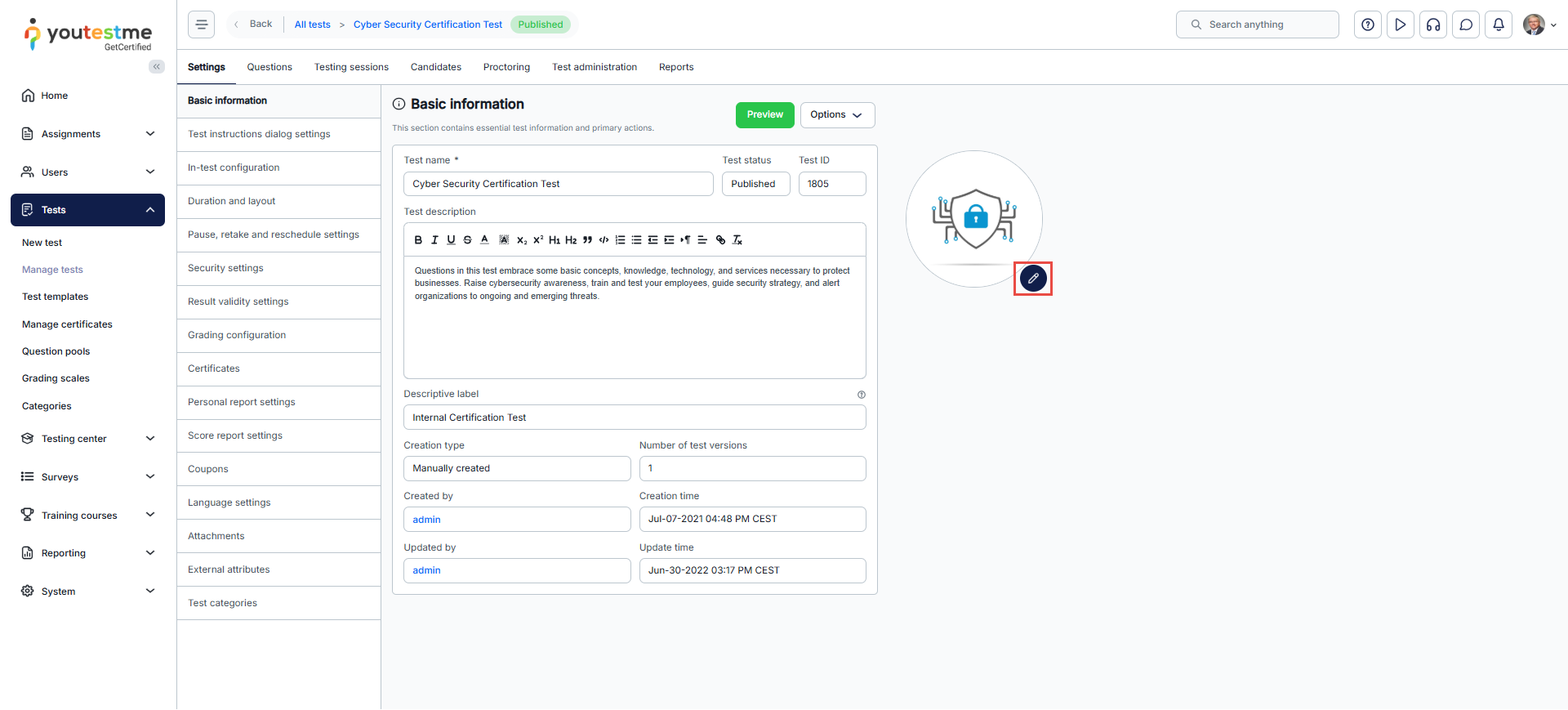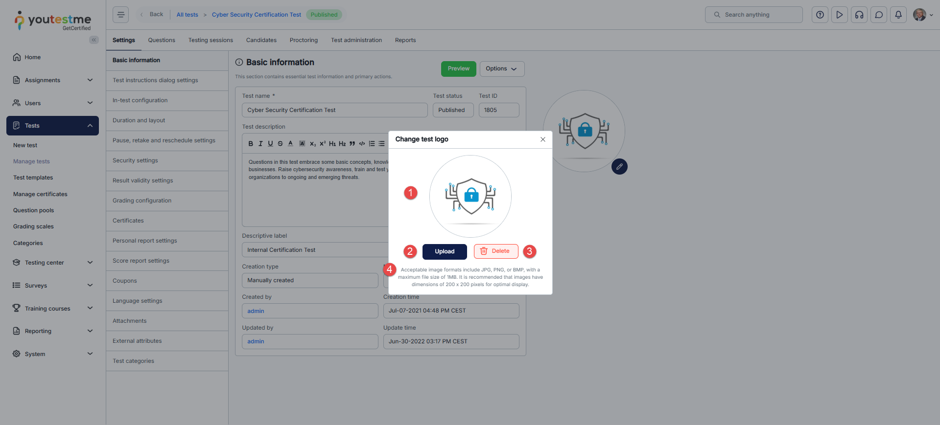 Navigate to your test’s Settings tab. In the Basic Information section, you will find the test logo box. Click on the pencil icon to edit the logo.