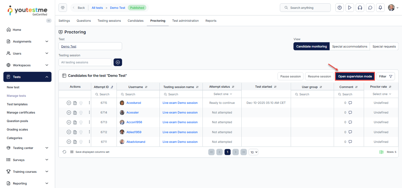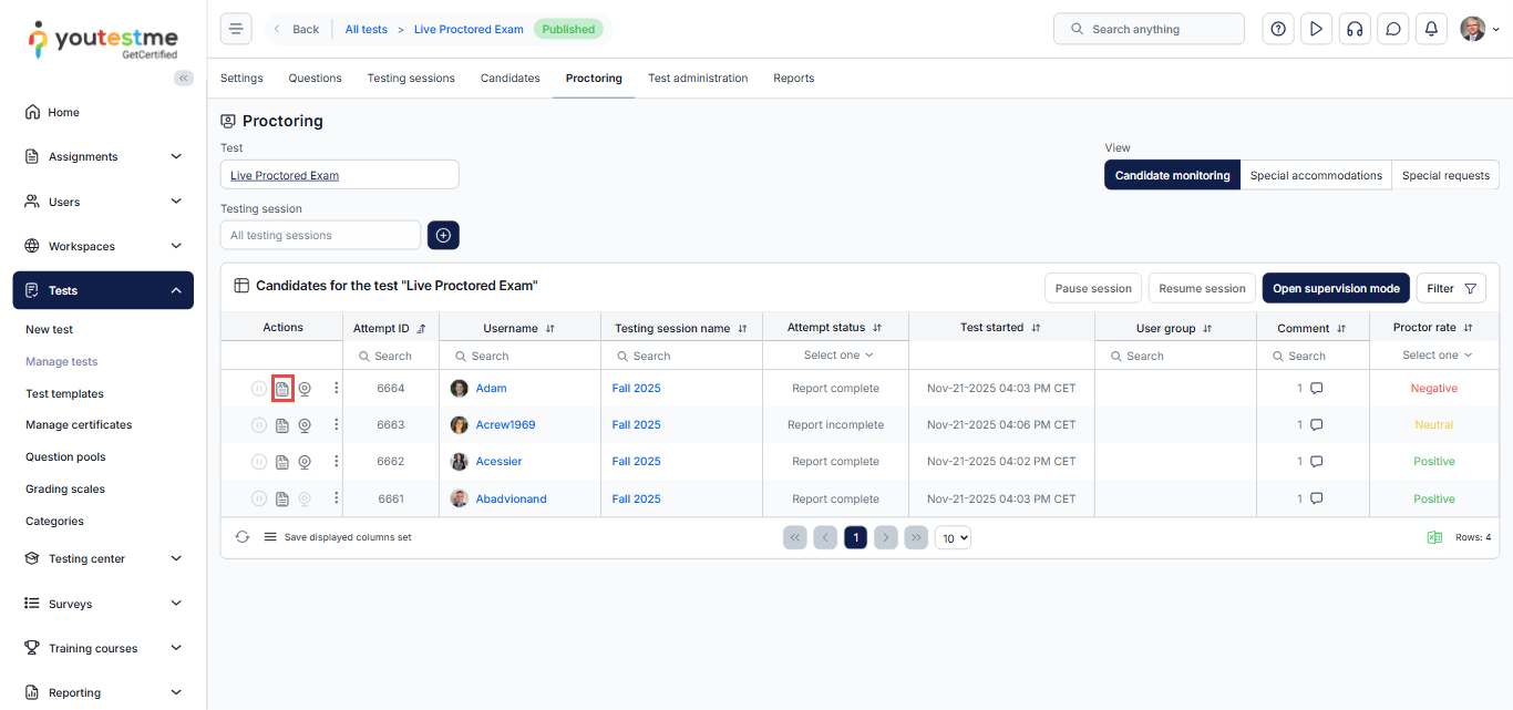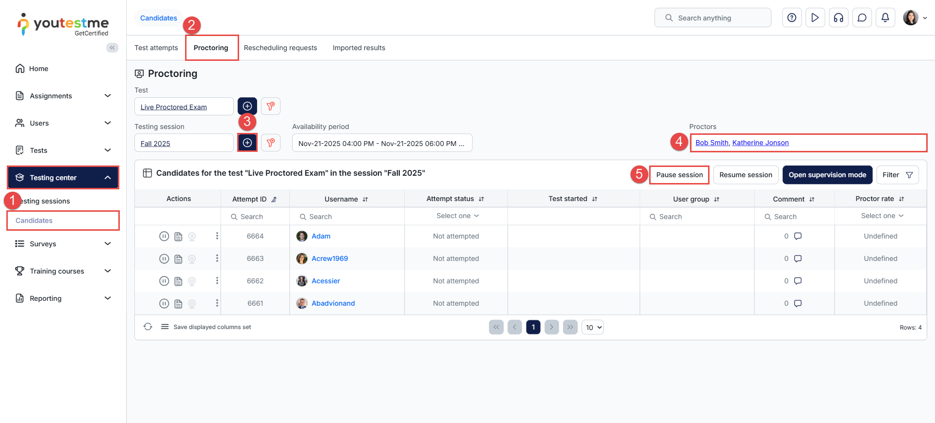 - Choose the proctored test and the testing session to filter the candidates’ list.