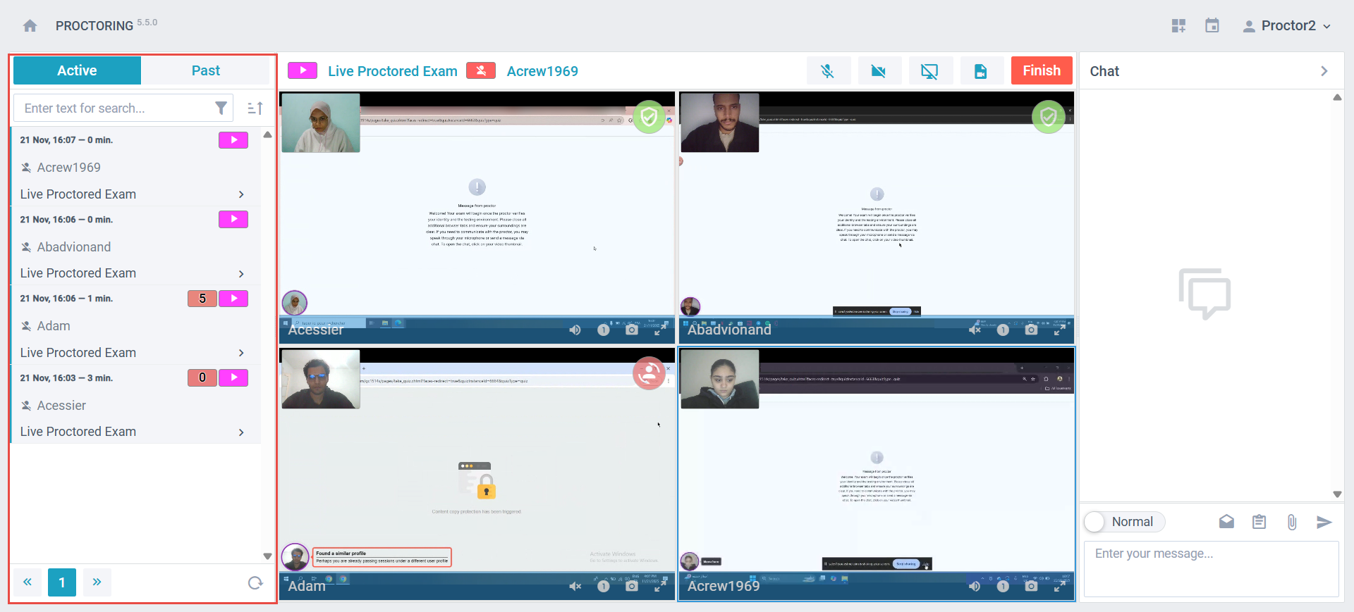 The proctor will be redirected to the exam room interface, where they can see the list of candidates joining the session on the left side of the screen. To display all candidates who have joined, the proctor should hold the Ctrl key and click each candidate’s username to add them to the view.