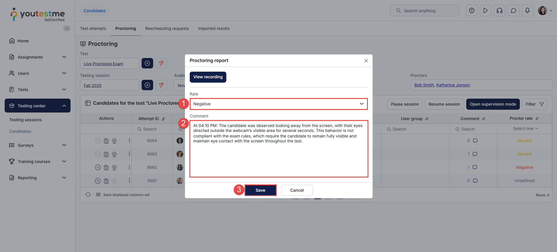 In some cases, reviewing the exam recording may be necessary to finalize the proctoring report and determine the appropriate rating.