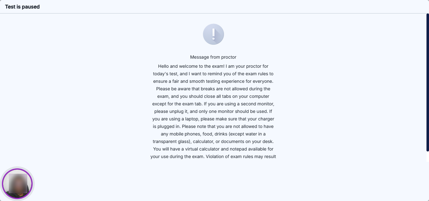 Once the candidate finishes the equipment check, they may be placed in a queue depending on the exam rules. A pause screen with a welcoming message and a reminder of the exam rules will be displayed, asking candidates to wait while the proctor verifies their ID and environment. The proctor can unpause the test for one student as soon as their check is complete or for all students at once. Only then does the test timer start.